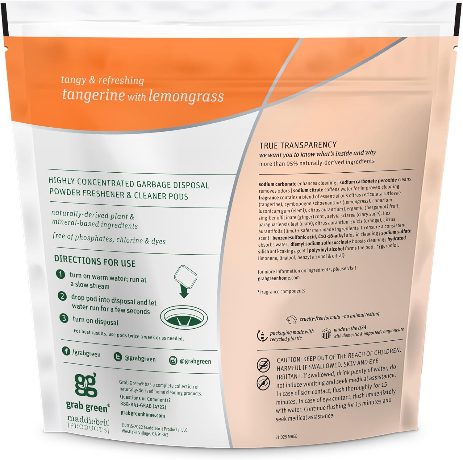 - Contains 1-12 pod pouch of Grab Green Garbage Disposal Freshener & Cleaner Pods, Tangerine + Lemongrass.