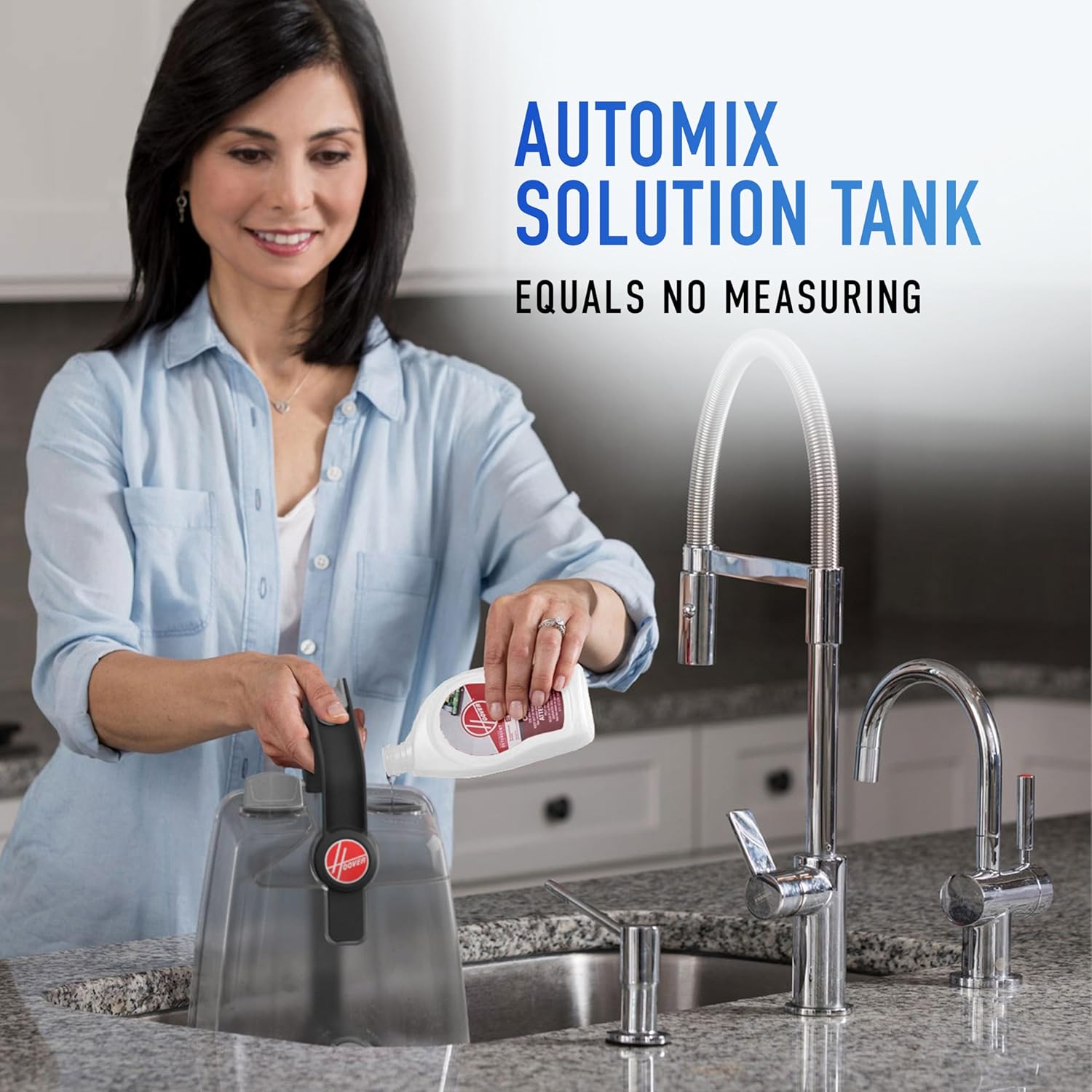 - AUTO MIX: This Hoover carpet cleaner machine has an Auto Mix feature that precisely mixes and dispenses solution for optimal carpet washing. Package includes upholstery tool, pet tool, crevice tool, 8 ft. hose, sample solution.
