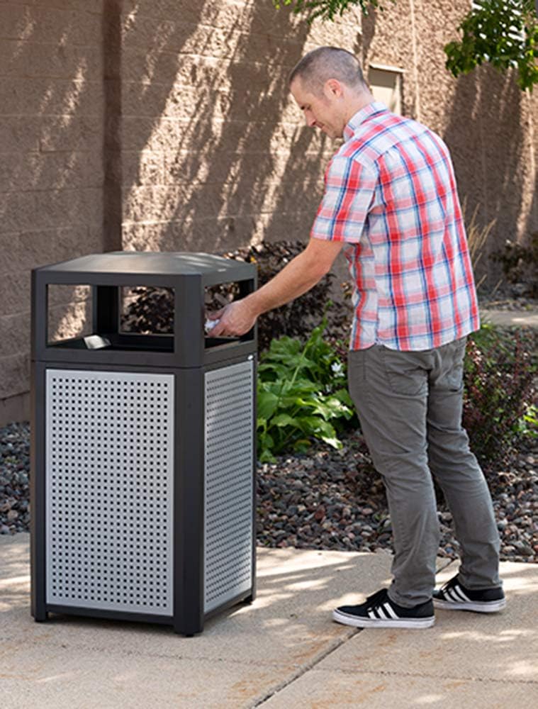 - MODERN STYLING. Evos Outdoor and Indoor Steel Trash Can features four stylish perforated panels on a heavy-duty steel frame with a galvanized base to resist rust and corrosion while keeping high traffic areas clean and litter free.