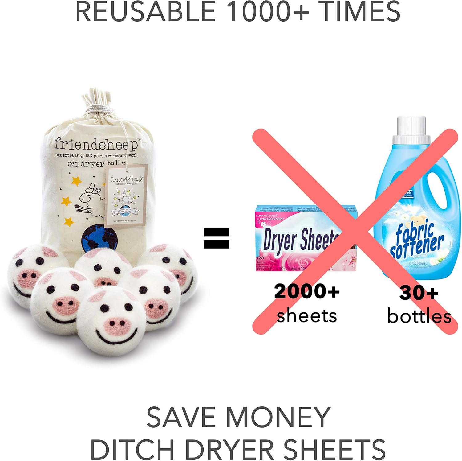 Friendsheep Wool Dryer Balls 6 Pack XL Organic Premium Reusable Cruelty Free Handmade Fair Trade No Lint Fabric Softener Pig - Piggy Band