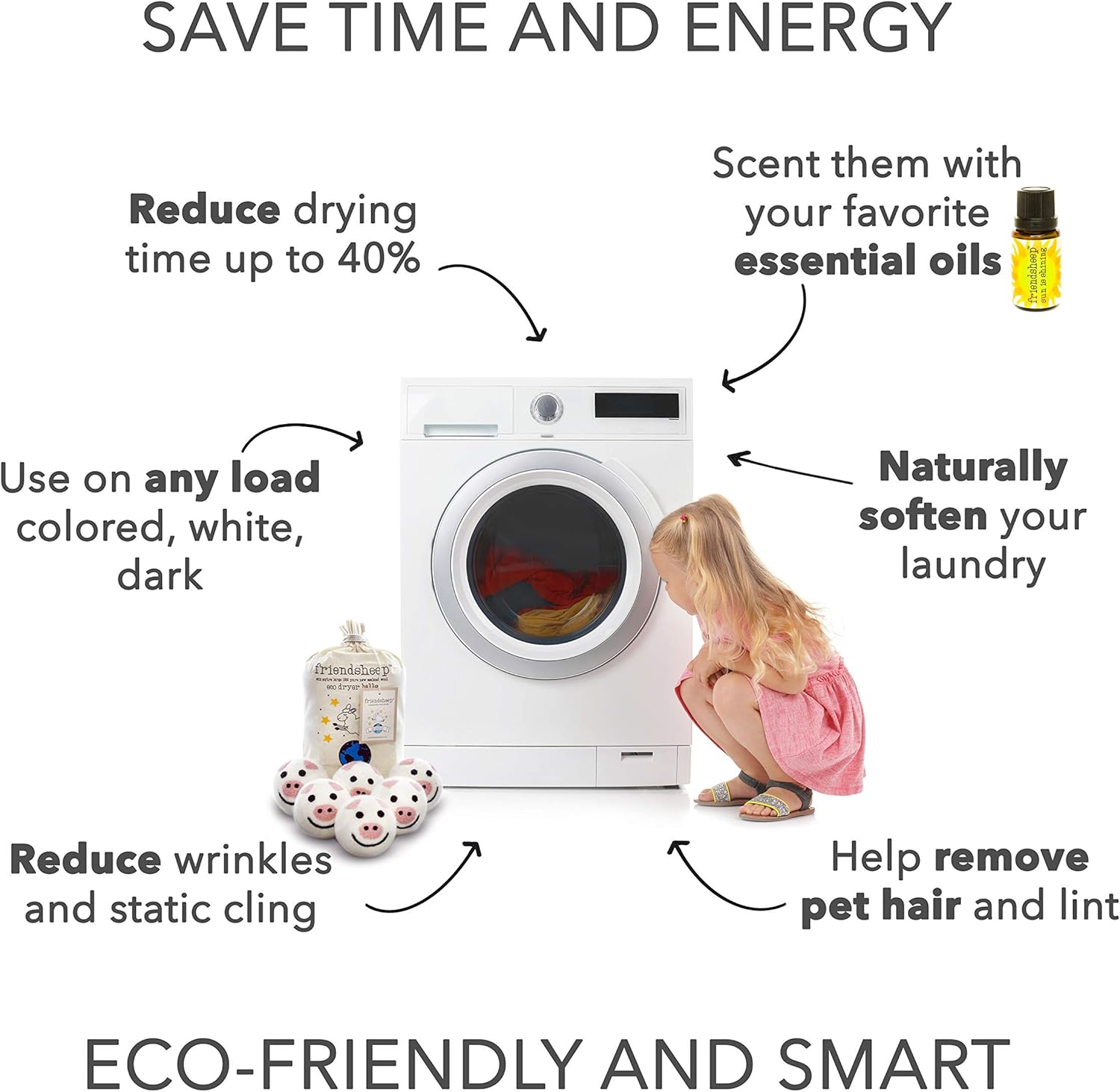 - ECO-FRIENDLY AND REUSABLE FOR 1000+ LOADS, replaces dryer sheets & liquid fabric softeners. Makes your laundry soft and fluffy, reduces wrinkles and static cling, and shortens drying time by up to 40% depending on load size. Your sheets and towels are fluffier, less balling and twisting. Makes you SAVE TIME, ENERGY, AND MONEY! All by keeping safe and healthy you, your family and the environment.
