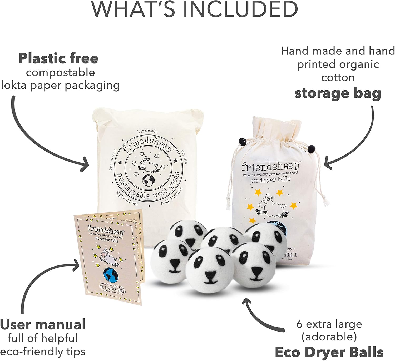 - PLASTIC-FREE + COMPOSTABLE. 6 XL wool balls in a cotton storage bag. The perfect eco-friendly all-occasions gift: Birthday, Baby Shower, Bridal Shower, Housewarming, College Graduation, BFF Day, Christmas, Teacher Appreciation, Mothers Day, and more!