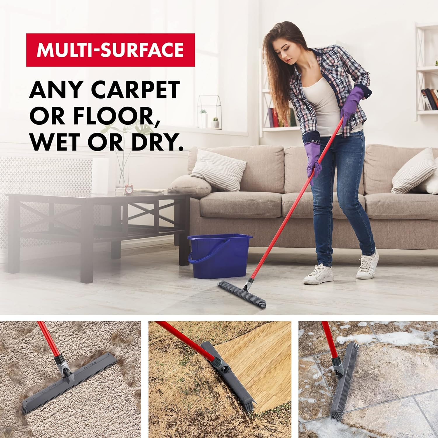 2-in-1 Silicone Rubber Broom Carpet Rake and Squeegee - Swivel Pet Hair Removal Broom with 1 Piece Long Handle - Slanted Side Bristles for Corners - Multipurpose Broom for Carpet, Hardwood Floor, Tile