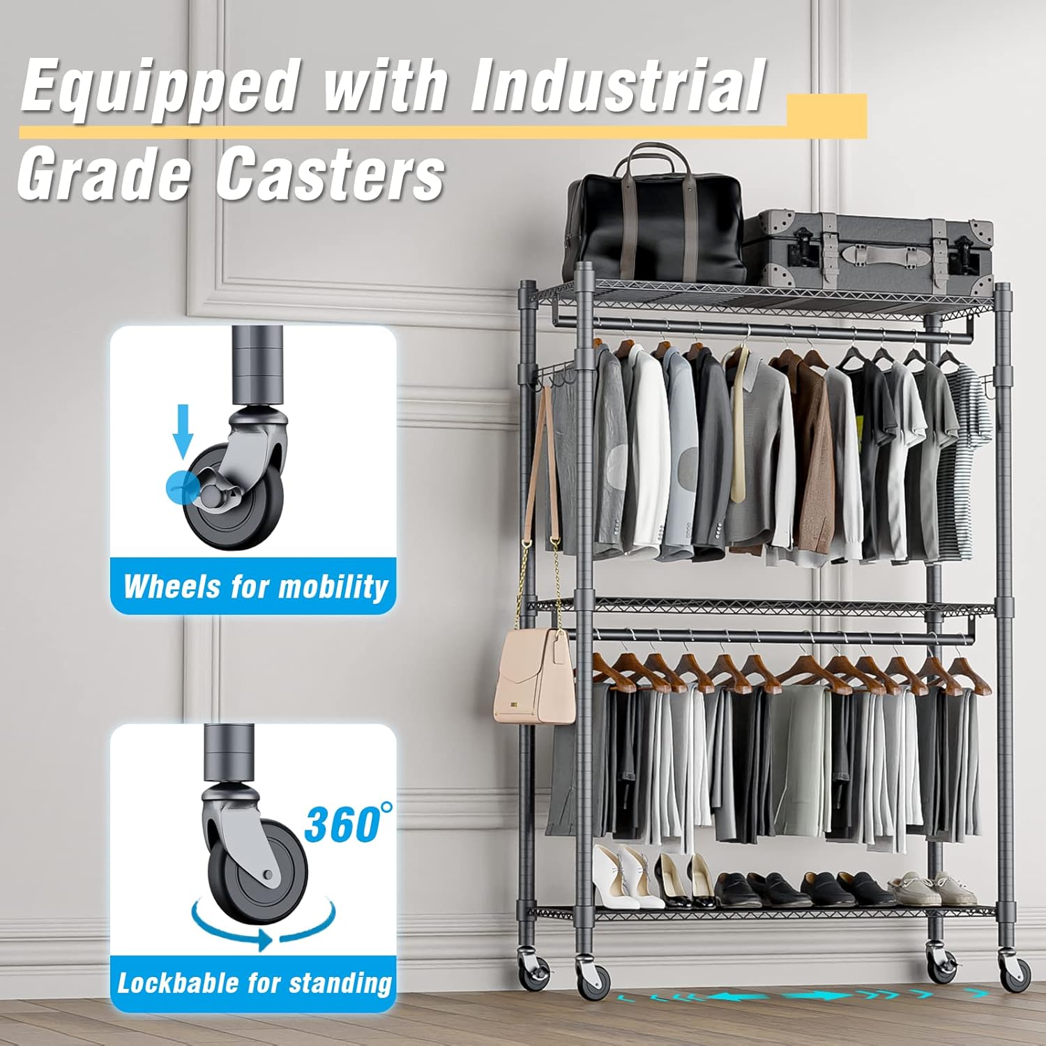 Homdox Rolling Clothes Rack Heavy Duty, 3-Tier Adjustable Wire Shelving Garment Organizer with Double Rods & Hooks, Portable Clothes Rack with Wheels, 17.72" D x 47.24" W x 80.71" H, Grey