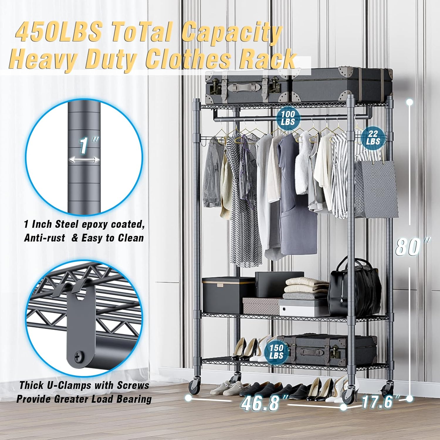 - 【LOCKABLE 360° WHEELS】 Equipped with 4 rolling wheels, 2 of them are locking wheels, designed to allow you to roll this clothing garment rack where ever you need in home. Easy access to bedroom, cloakroom, clothing store, laundry room, walk-in closet and more