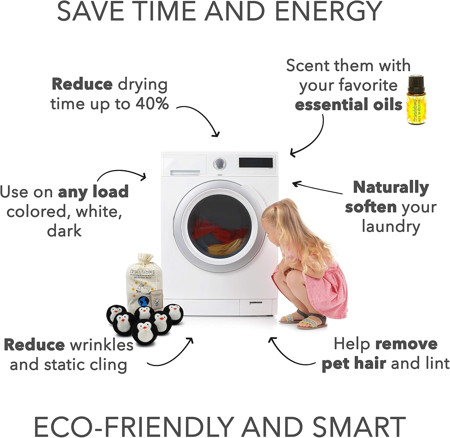 Friendsheep Wool Dryer Balls, Organic Fair Trade Reusable Fabric Softener, Extra Large, 6 Pack, Black Penguin - Cool Friends