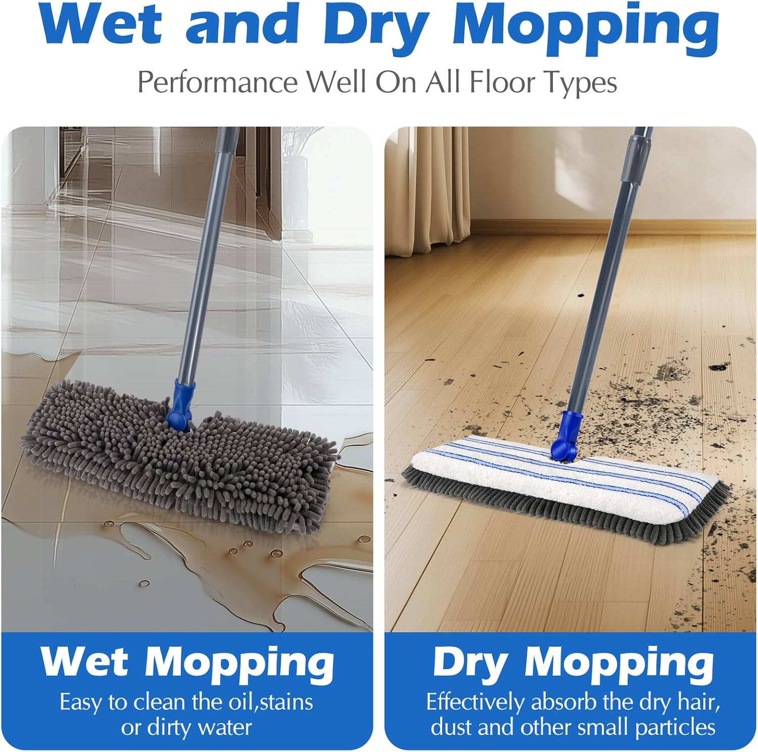 - Dual-Sided Magic Mop: Flip & Clean Smarter, Not Harder!Flip-to-Clean Technology.No more switching tools!Dry Side (Plush Chenille): Instantly captures dust, crumbs & pet hair like a magnet.Wet Side (Absorbent Microfiber): Locks in spills, scrubs grime & leaves floors streak-free.