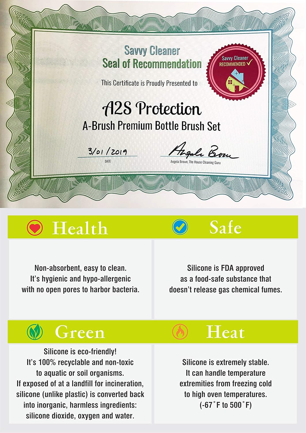 A-Brush Silicone Bottle Cleaner Brush, 2 Piece Set, Flexible, Long Handle - Water Bottle Cleaner, Baby Bottle Nipple Brush for Plastic & Glass, BPA-Free Dish Washing Brush A2S Protection