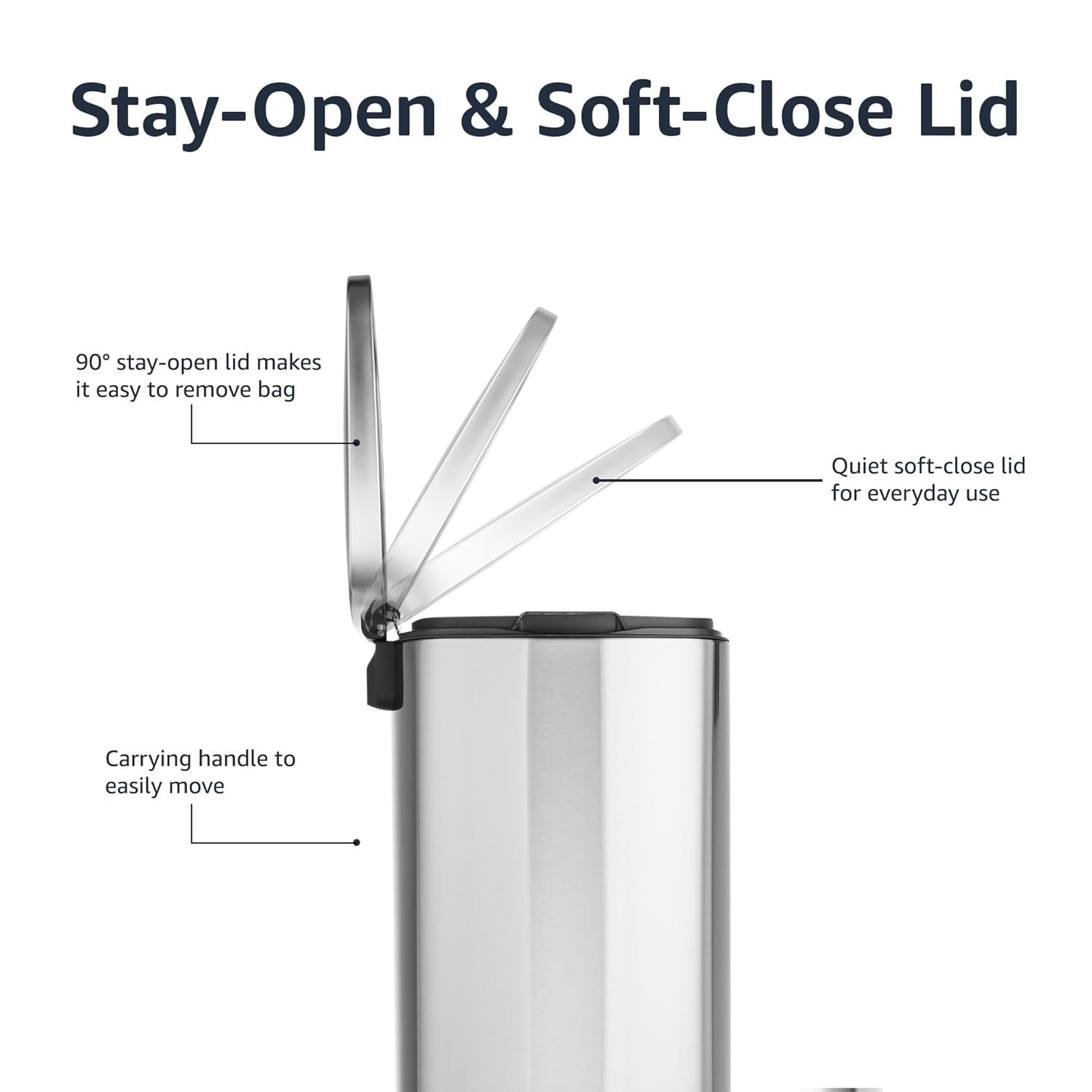 Amazon Basics Smudge Resistant Rectangular Trash Can With Soft-Close Foot Pedal, Brushed Stainless Steel, 50 Liter/13.2 Gallon, Satin Nickel Finish, 16.7"L x 14.7"W x 25.9"H
