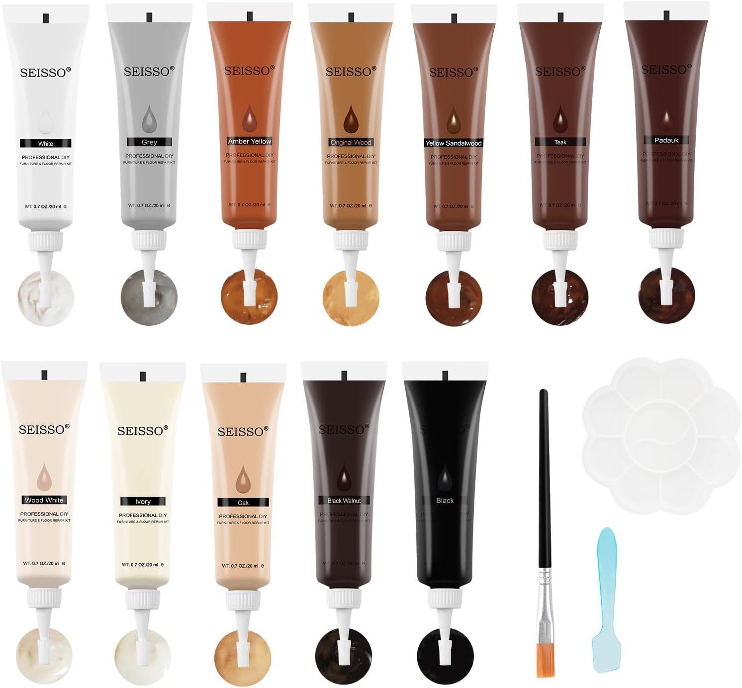 - Wood Furniture Repair Kit: SEISSO wooden filler set includes a diverse palette of 12 colors resin repair fillers paste (0.7 oz/20 g each) with a color palette, can help you repair quickly and makes the wood furniture marred by stains and scratches