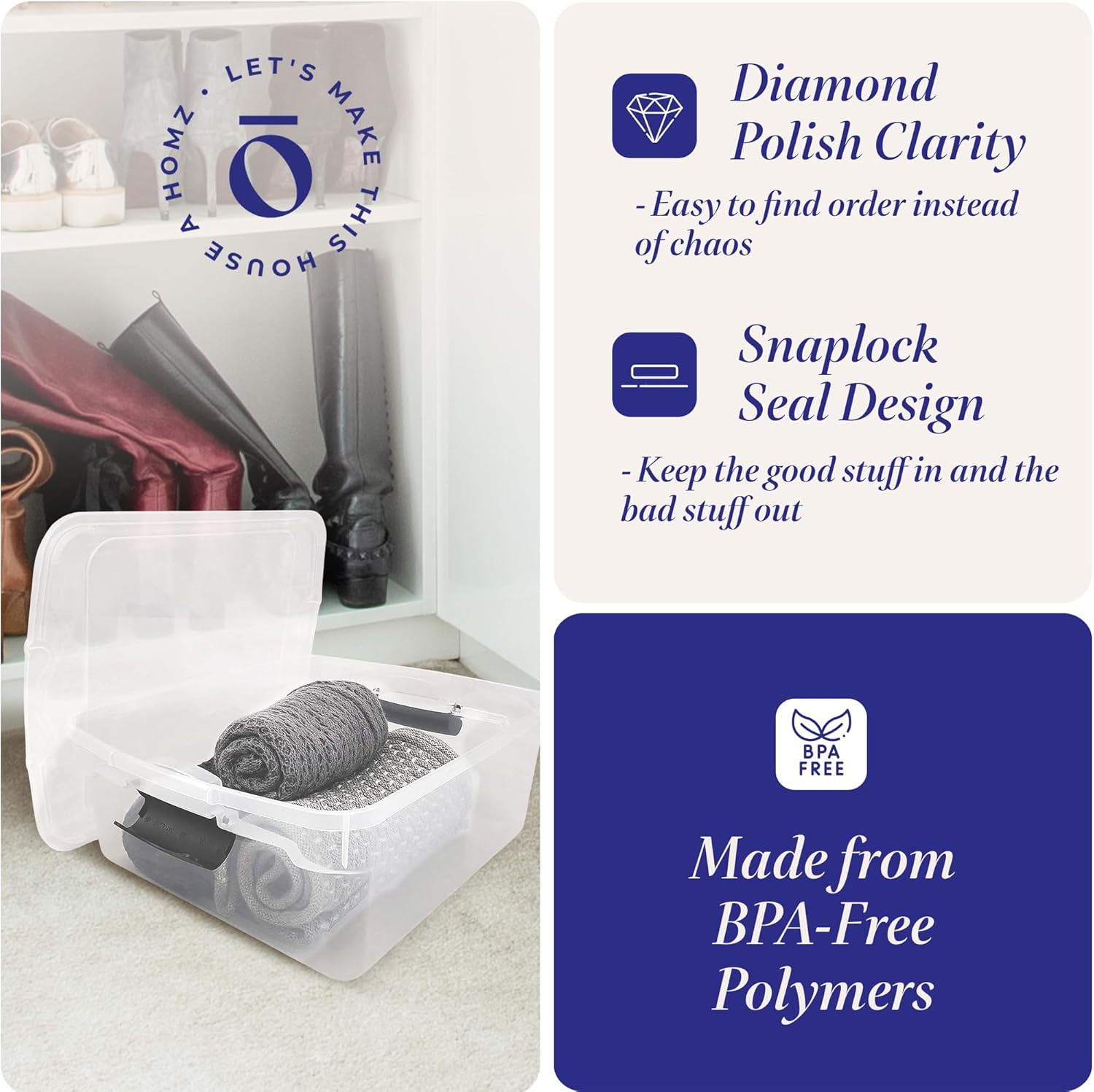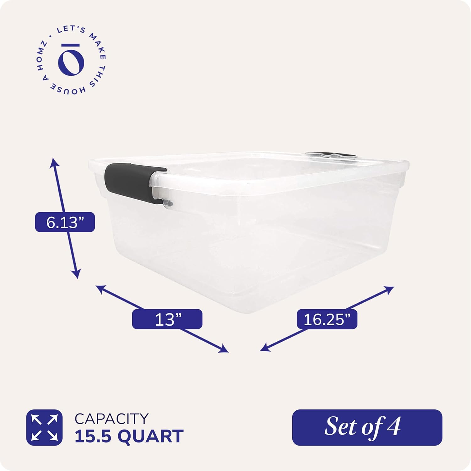 HOMZ 4-Pack Latching Lid, Clear Plastic Storage Organizer Bins, 15.5 Quart, Gray Latch - Stackable Organizing Containers for Home, Garage, and Office