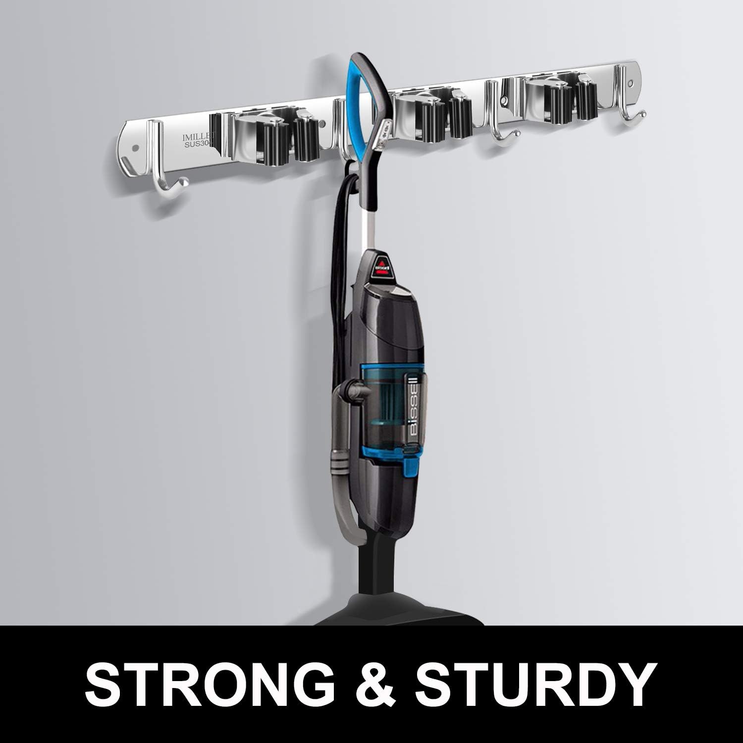 IMILLET Broom and Mop Holder Wall Mounted, Stainless Steel Broom Holder Mop Holder Self Adhesive Heavy Duty Hooks Storage Organizer for Home Laundry Room Garden Garage(3 Racks with 4 Hooks)