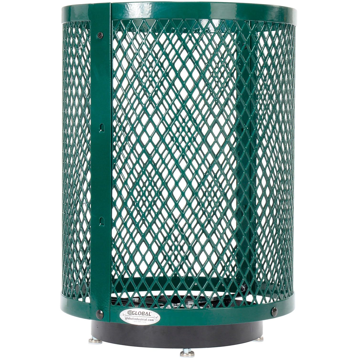 Global Industrial Outdoor Diamond Steel Trash Can with Rain Bonnet Lid, Raised Base and Plastic Liner, 36 Gallon Capacity, Green, Thermoplastic Coating, 23-1/2" Diameter, 43-1/2"H