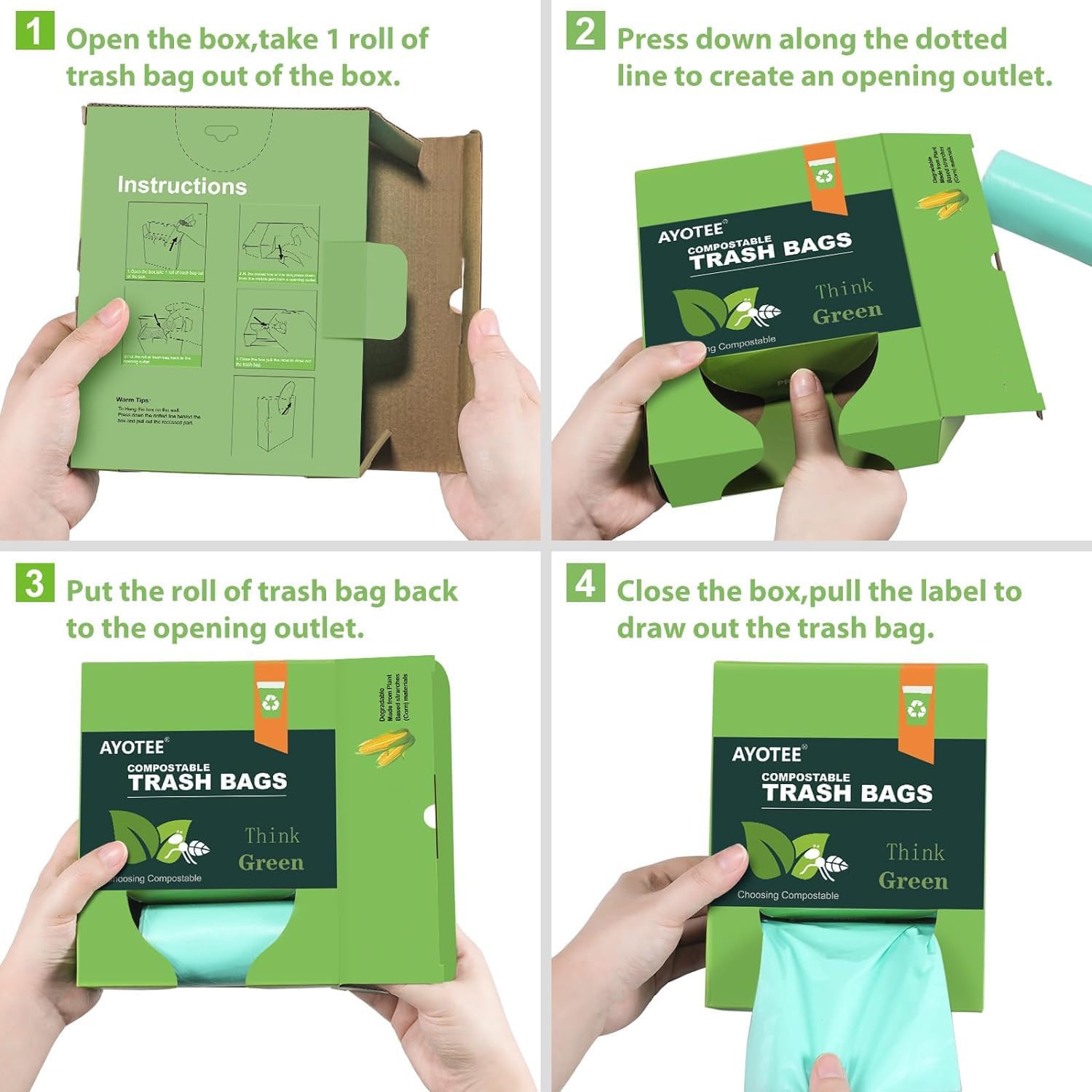 - Small Compost Trash Bags: The main materials for our small trash bags are made of plant starch extract(PSM). Certified compostable and meeting the standards of ASTM. Come in a practical box which makes it easy to draw out and store these small garbage bags Small Compost Trash Bags: The main materials for our small trash bags are made of plant starch extract(PSM). Certified compostable and meeting the standards of ASTM. Come in a practical box which makes it easy to draw out and store these small garbage bags