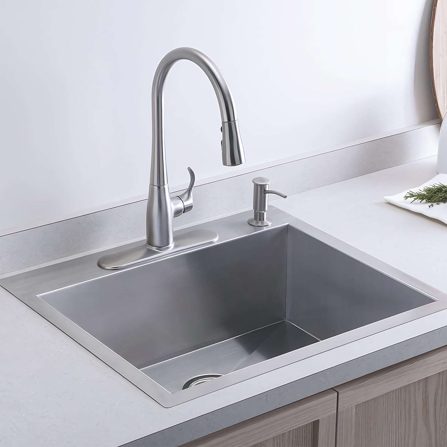 - 【Easy to Clean】The single bowl kitchen sink's R10 corner design eliminate hard-to-reach sharp corners, making cleaning quick and hassle-free. Removable basket strainer helps keep food and debris from clogging the drain pipe