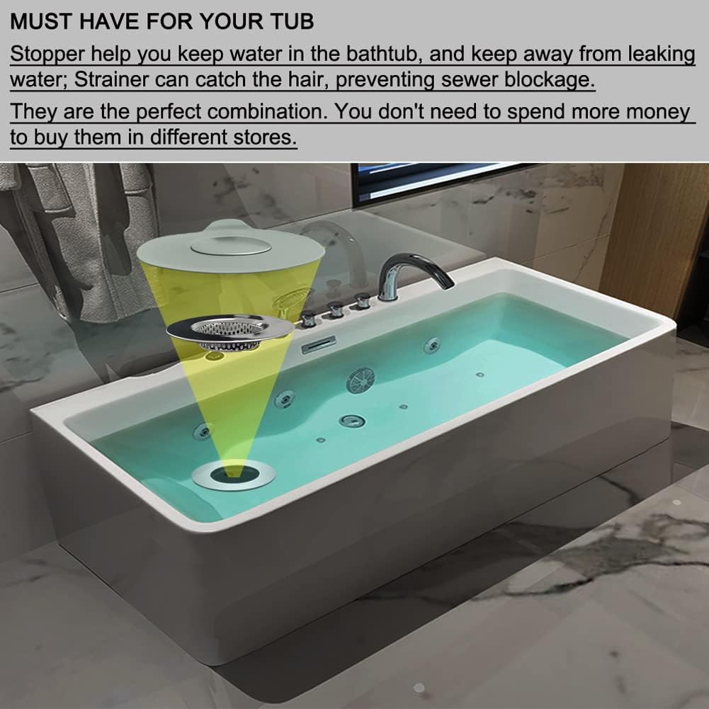 - [PACKAGE INCLUDED] You will get 1 piece silicone bathtub stopper and 1 piece stainless steel drain filter.