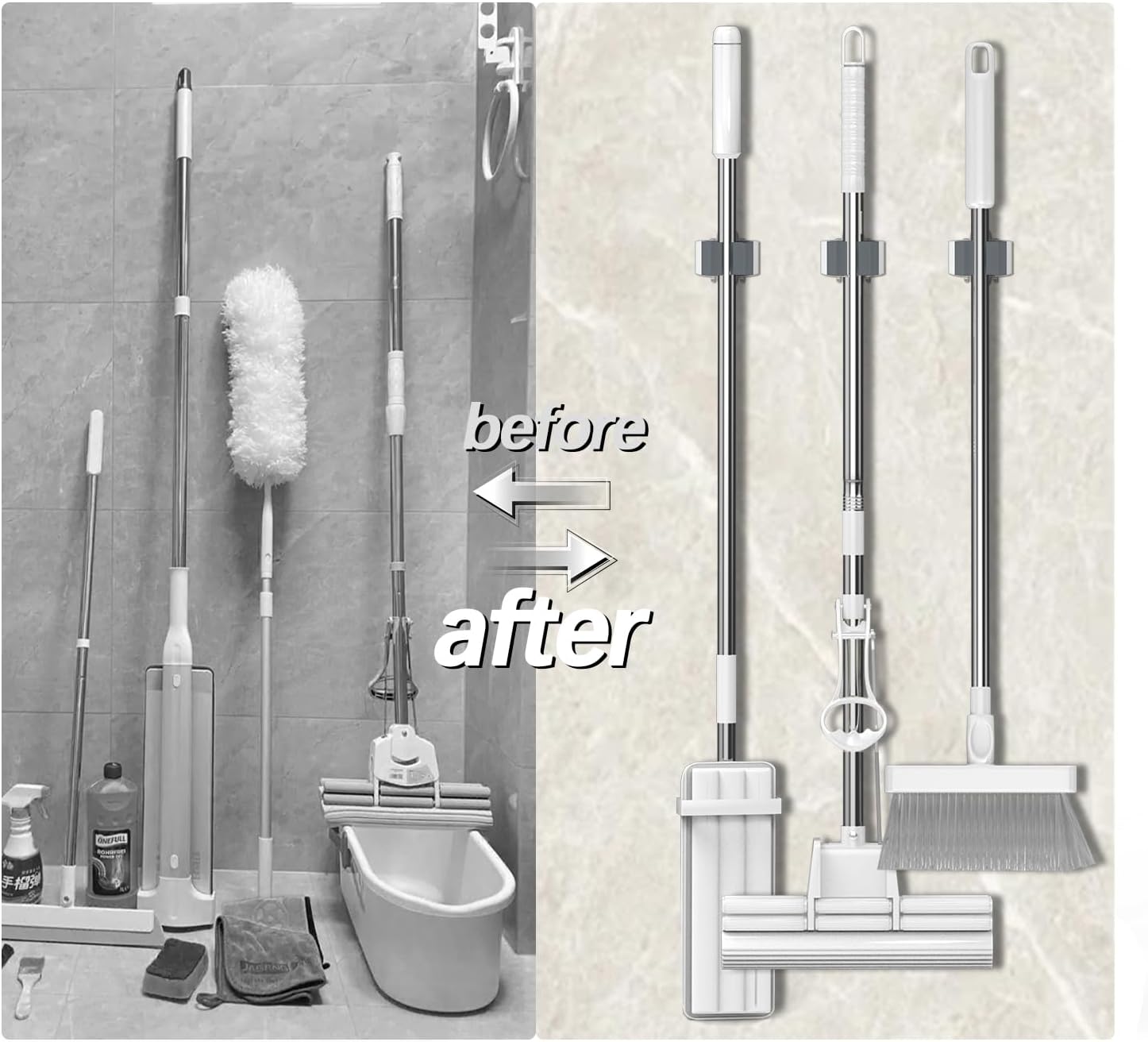 - EASY TO USE: Because mop broom holder wall mounted is made of 0.7mm thick metal material instead of 0.5mm as most of the ones on the market, you don’t have to worry about deformation even if you use it indoors or outdoors for a long time.You can slide the broom in and out with one hand. Unlike plastic mop holders with spring-loaded rollers, this broom organizer wall mount has rubber rollers to hold the handles, allowing the handle to slide in from the front and be held firmly in place.