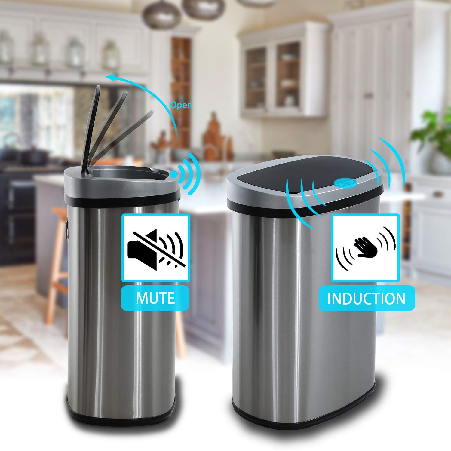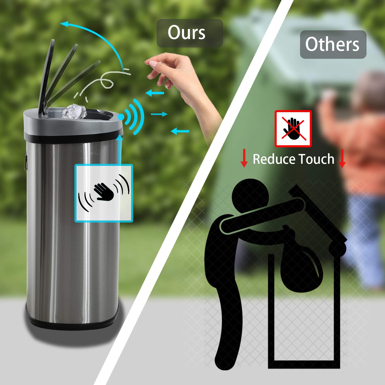 - High-Tech Induction Device : Our touch free trash can used high technology induction device, whether it is sensing the proximity of a human hand or an object, it can respond quickly to open the lid of the trash can, and automatically close the lid within 5 seconds after the trash is thrown in.