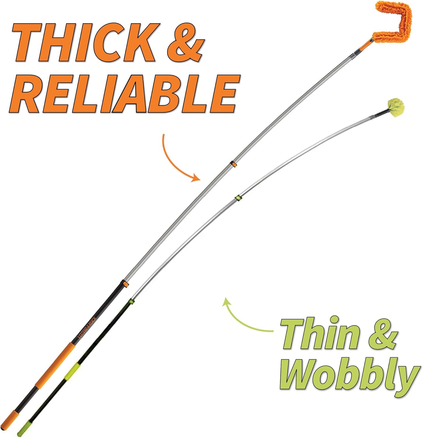 - 【THE ONE EXTENSION POLE THAT WON’T BREAK】- Made of meticulously-crafted, extra-thick aluminum, this extendable telescopic pole is stiffer, tougher, and stronger. While other high reach extension poles can get wobbly and fragile when fully extended, the EXTEND-A-REACH telescopic pole will always perform solidly. The pole also features quick-release thumb lever clasps for easy extension control and non-slip hand grips to ensure maximal stability and reliable grip.