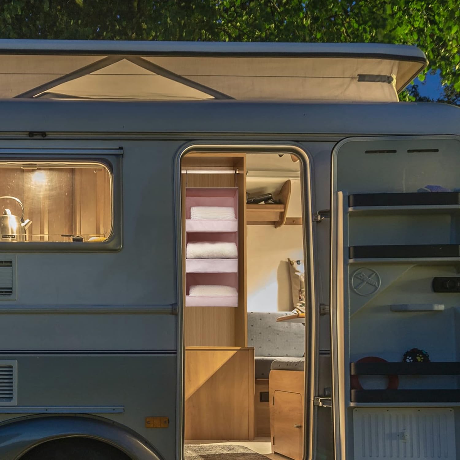 - 3-shelf organizer works great in closets, shelves, wardrobes, RVs, camper trailers for storing towels, T-shirts, socks, accessories, bibs, diapers, baby wipes, etc.