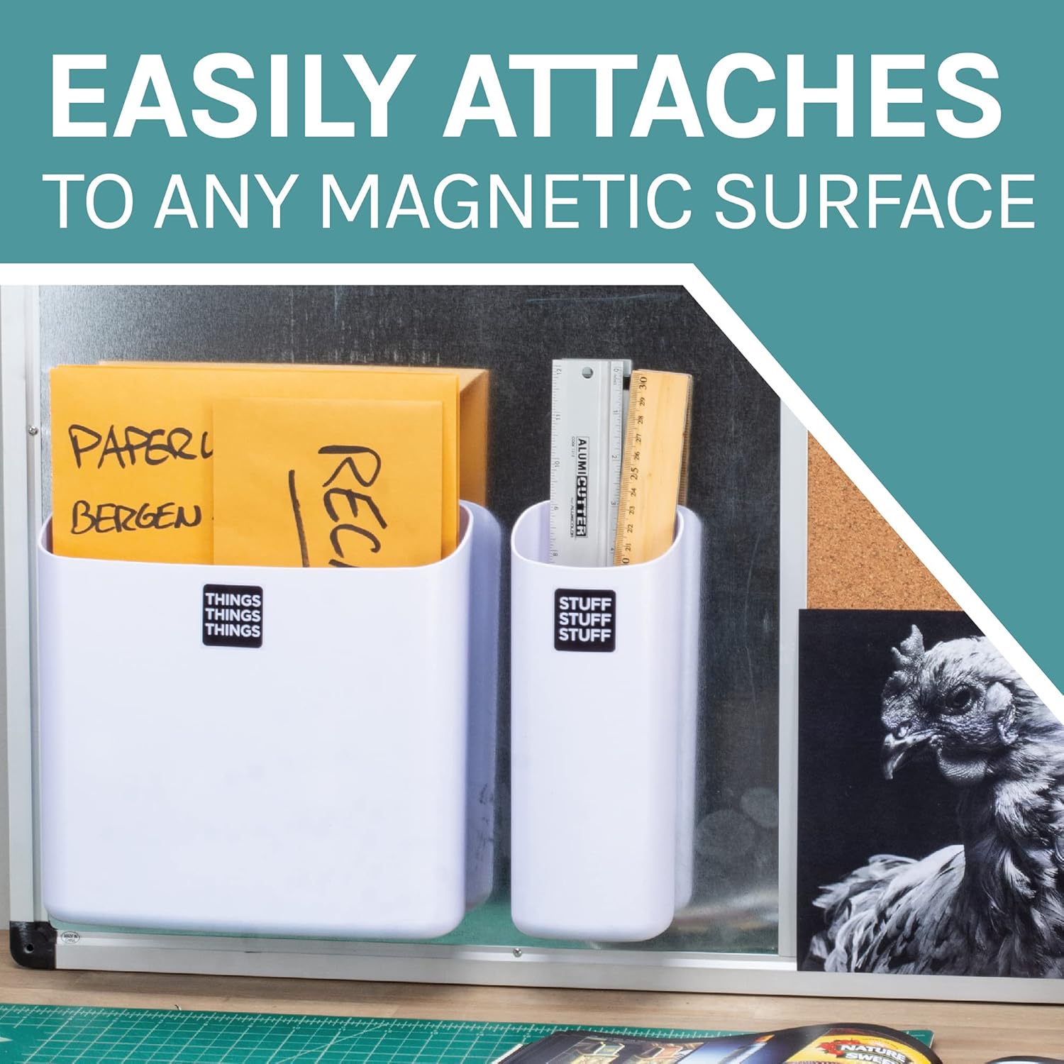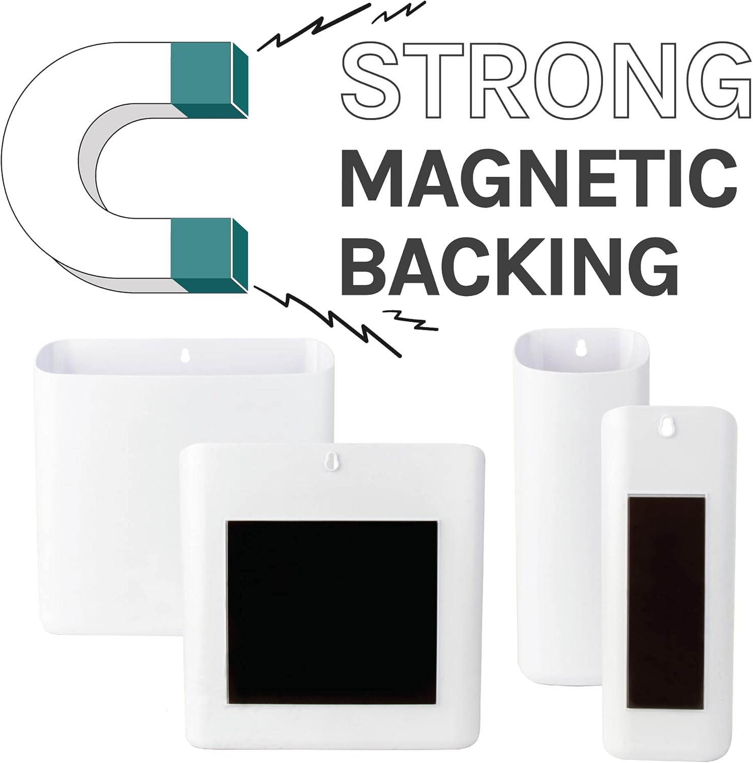 - No need to worry about the bins sliding down your washer, dryer, or refrigerator. The large powerful magnets measure 6.25 x 5.5 in. on the large bin and 5.375 x 2 in. on the small bin.