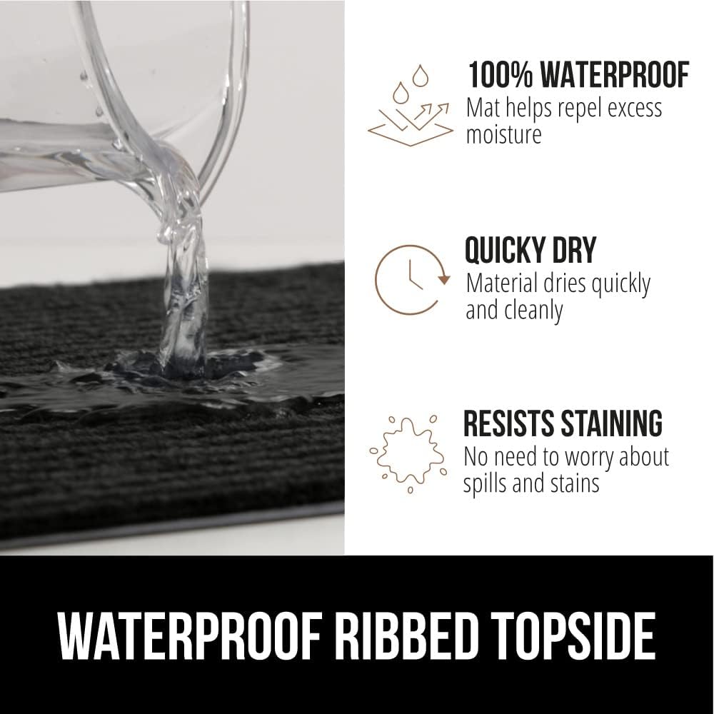 - WATERPROOF RIBBED TOPSIDE: ultra absorbent and 100% waterproof, the mat's surface helps to capture excess water and moisture; plus, premium fabric dries quickly and resists staining and fading for long lasting use