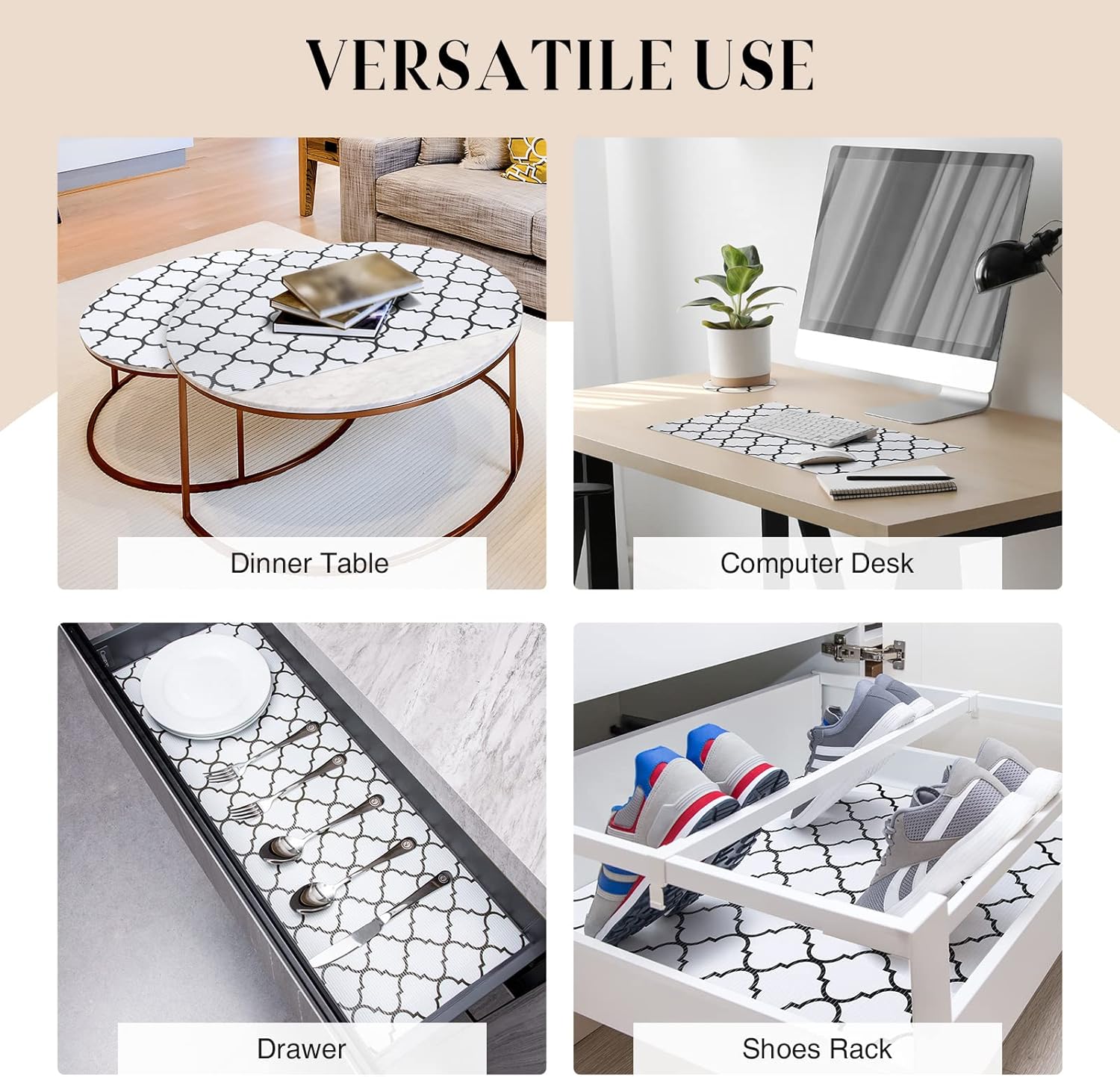 - Shelf Liners for Kitchen Cabinets Non- Adhesive for Easy Installation:This black and white shelf liner non adhesive is in the most popular pre-cut sizes for easy installation. For unique sizes and shapes, you can simply trim the kitchen cabinet liner with household scissors. Just place the liners down in your drawer or cabinet and trim off any excess material. Plus, the drawer liners are non-adhesive and easily removable