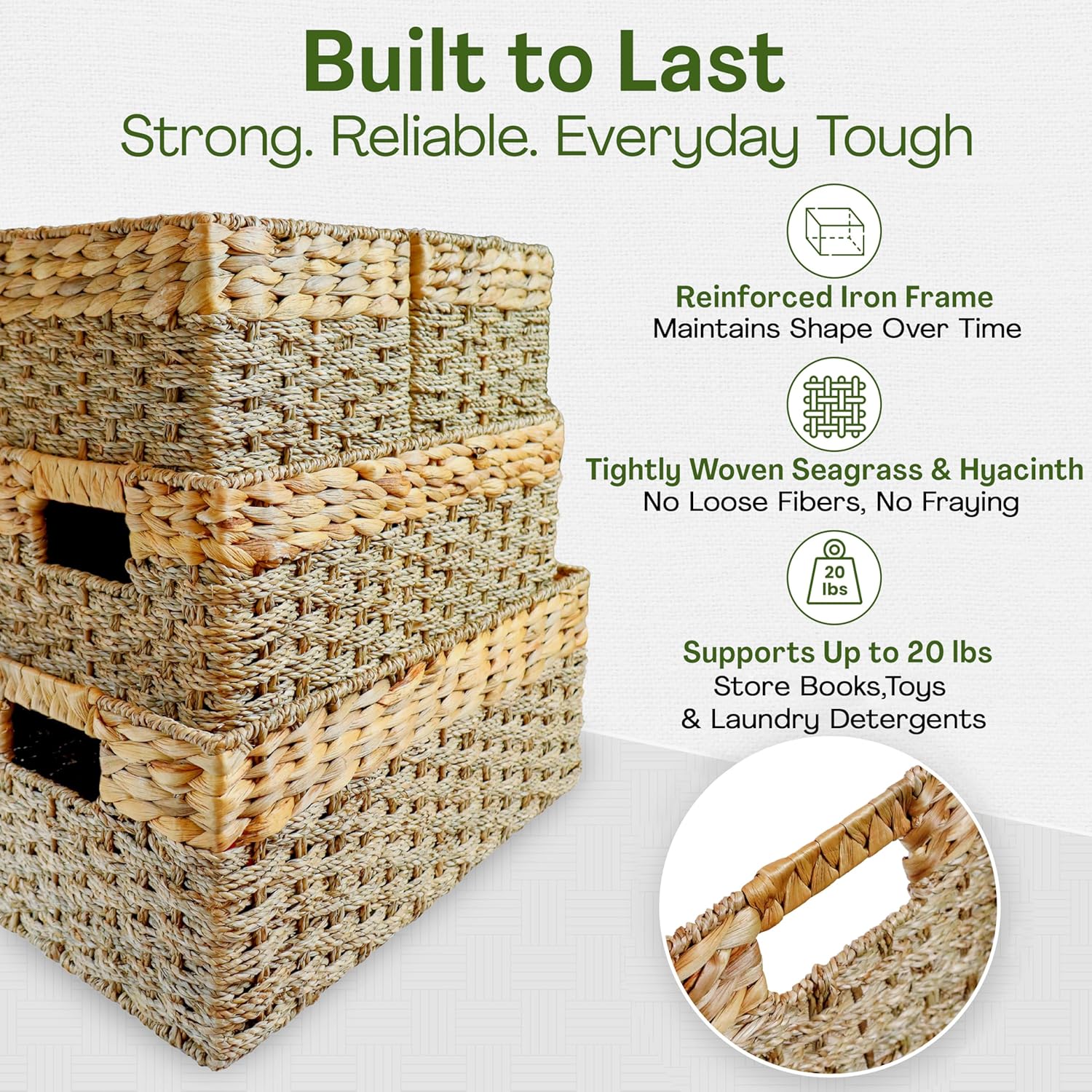 - STRONG AND BUILT TO LAST - These water hyacinth storage baskets are durable. The square basket holds up to 20 lbs, perfect for books and essentials with a tight weave and reinforced iron frame structure. Perfect decorative pantry baskets for daily, heavy-duty storage.