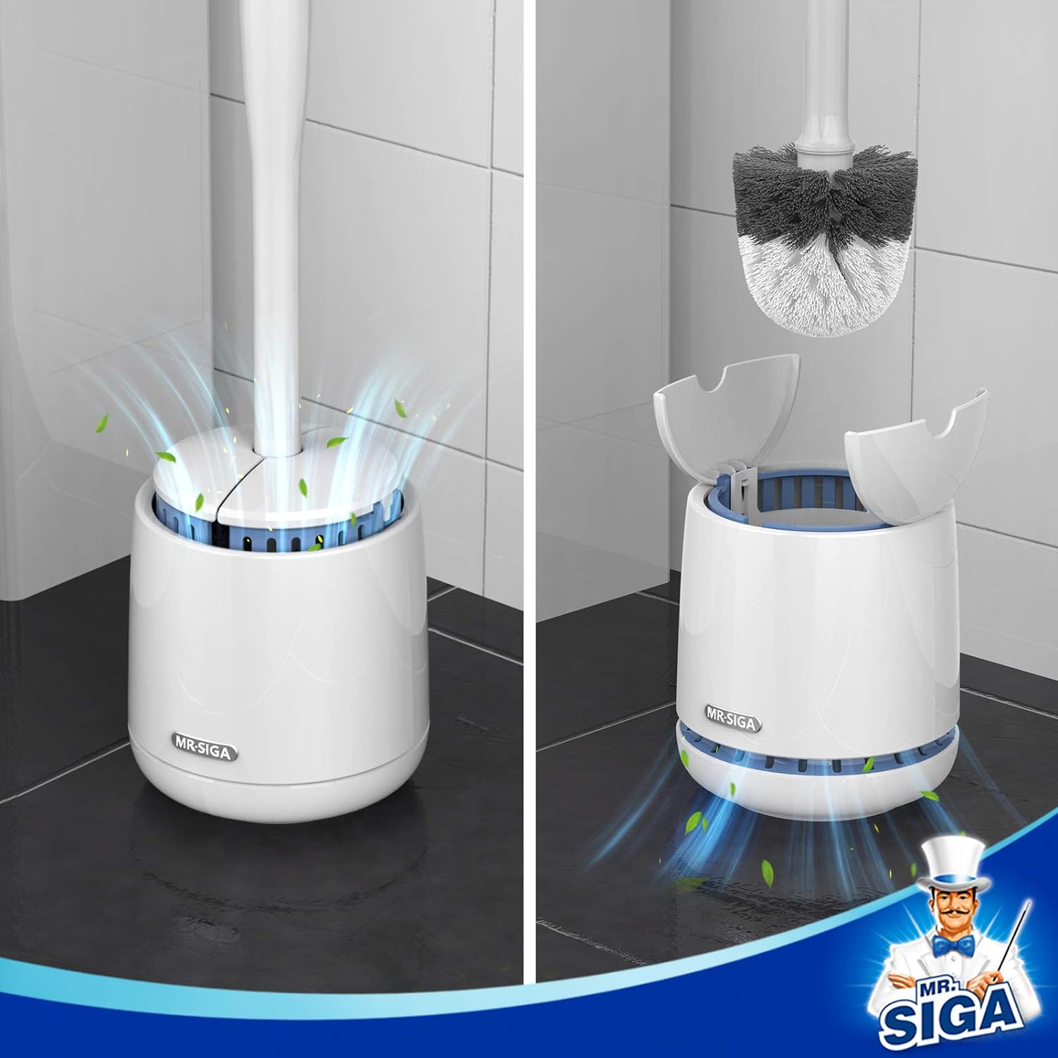 - UPGRADED VENTILATION DESIGN - Lid opens automatically when toilet brush is lifted, and bottom ventilation allows for quick evaporation; Lid closes simultaneously when you place toilet brush back into holder, and the upper ventilation starts working which provides hygienic air dry. Compact space saving design keeps your toilet brush hidden and offers a sanitary storage.