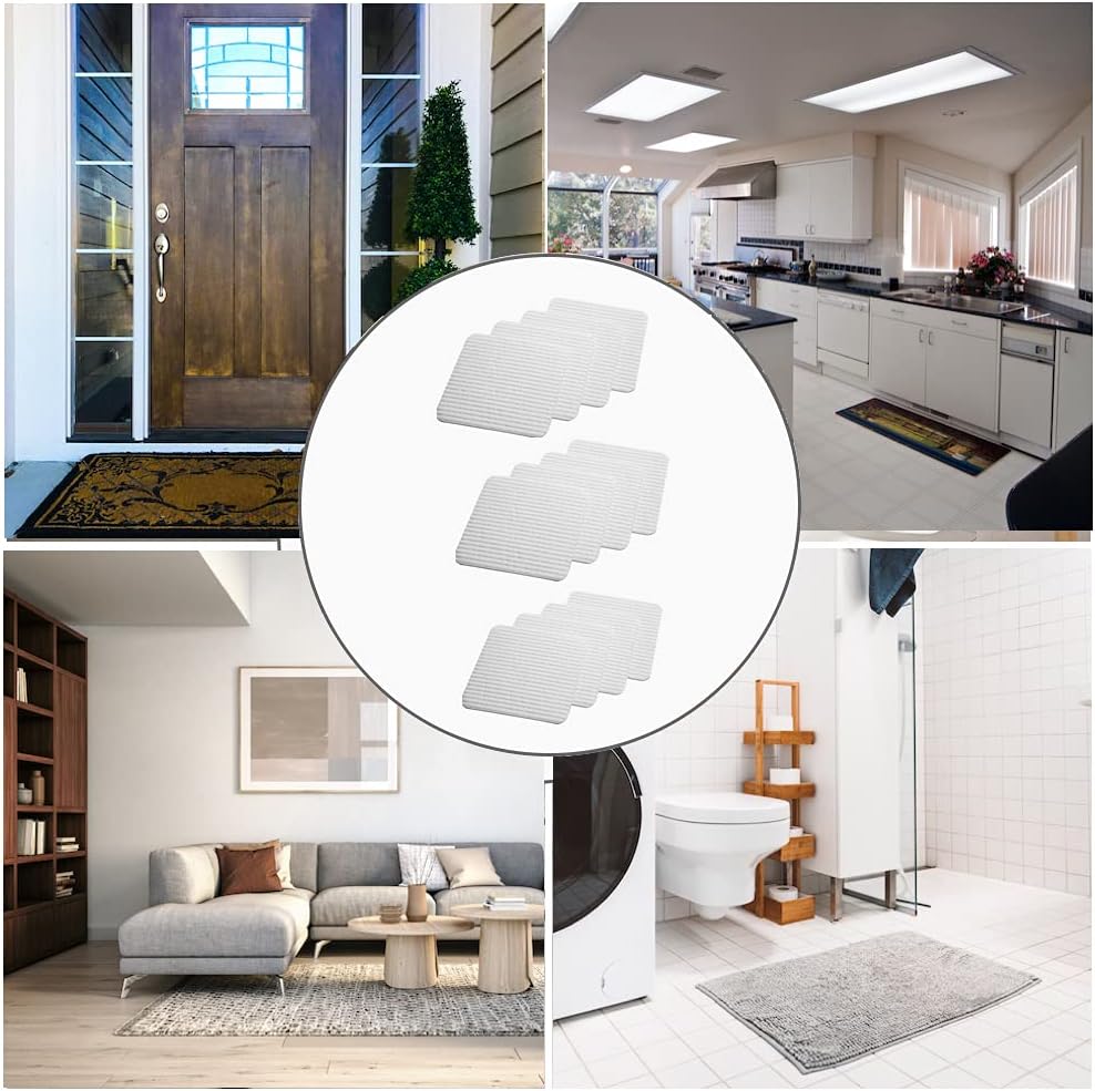 - Components. This package includes 12 pieces. The size of the gripper is 3.9inch x 3.9inch. Each piece is square in order to increase the surface area in contact with the floor. That leaves your kitchen, bathroom, and hallway much more secure. You can even use them outdoors to prevent slipping and flatten corners.