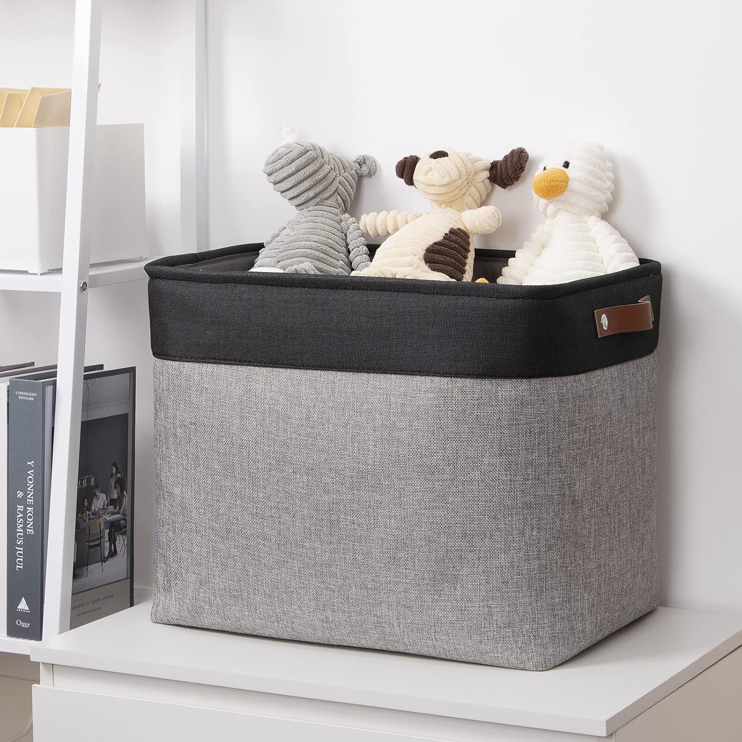 DULLEMELO Large Collapsible Storage Basket/Bin with Sturdy Leather Handles, Fabric Organizer Bin for Storage Clothes, Toys, Books, Office, Bedroom, Closet, Nursery & Laundry (Black&Gray)