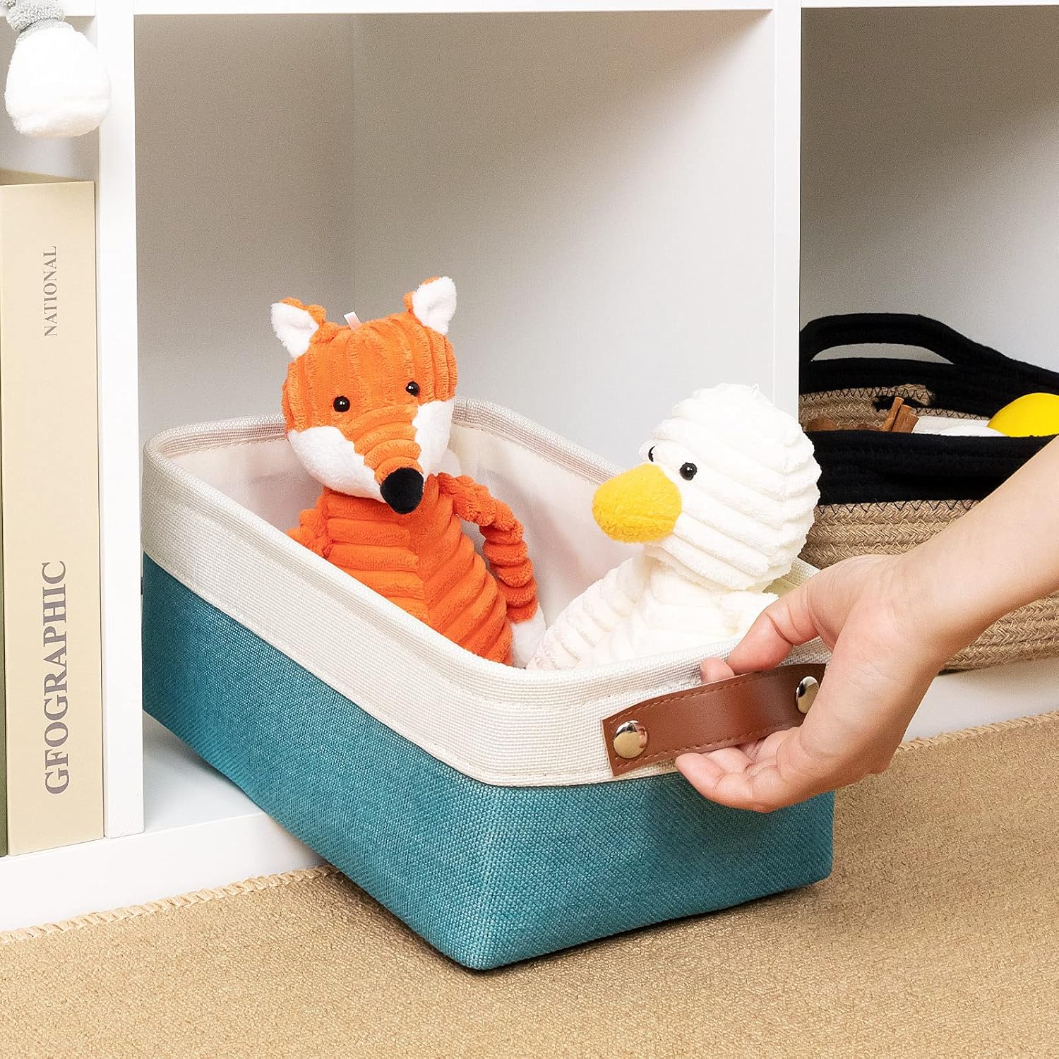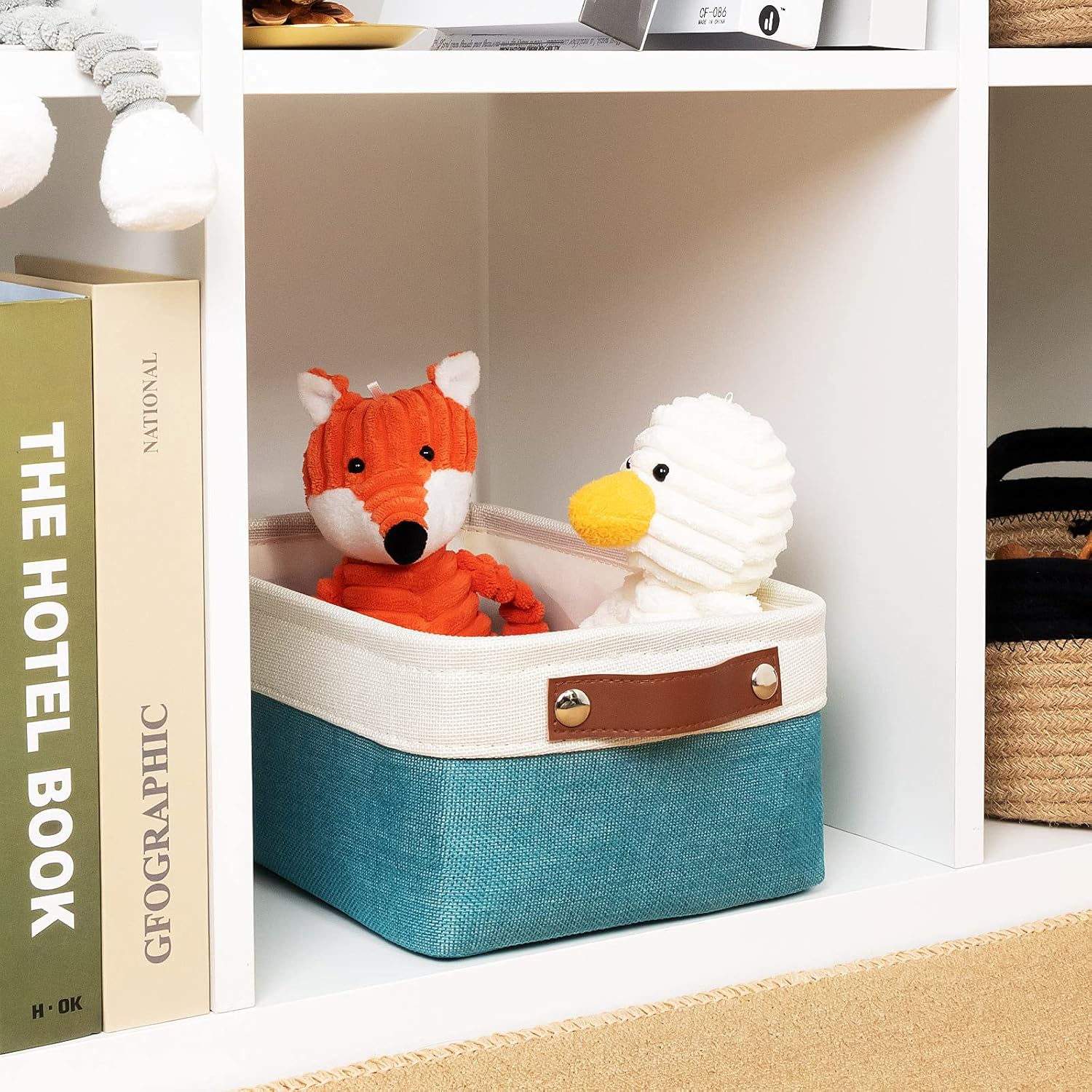 DULLEMELO Small Collapsible Fabric Basket for Organizing, Shelves, Closets, Laundry, Nursery, Decorative Gift Basket (White & Teal)
