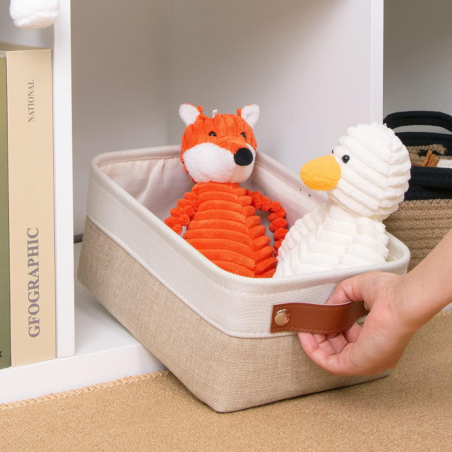 - 【SUITABLE SIZE】 The size of the fabric basket is 11.8"x7.9"x5.1", which provides a solution for organizing and storing baby products, clothes, toys, wipes, toilet paper, diapers, toiletry, towels, socks, scarves, gloves, underwear, leggings, CDs, DVDs, pet products, and many other uses