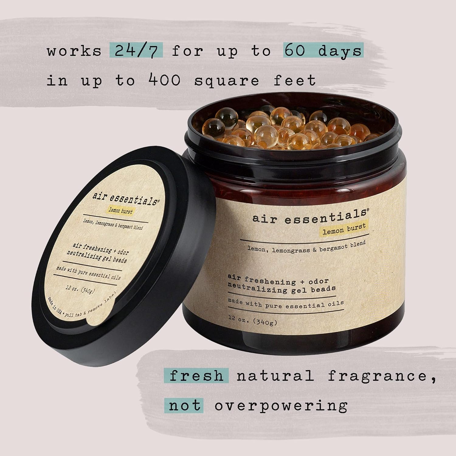- MADE WITH PURE ESSENTIAL OILS - Air Essentials Air Freshening & Odor Neutralizing Gel Beads contain only plant derived ingredients and a blend of pure essential oils. Each jar provides a pleasant fragrance that does not overwhelm the senses. The Gel Beads will work 24/7 for up to 60 days in up to 400 square feet.