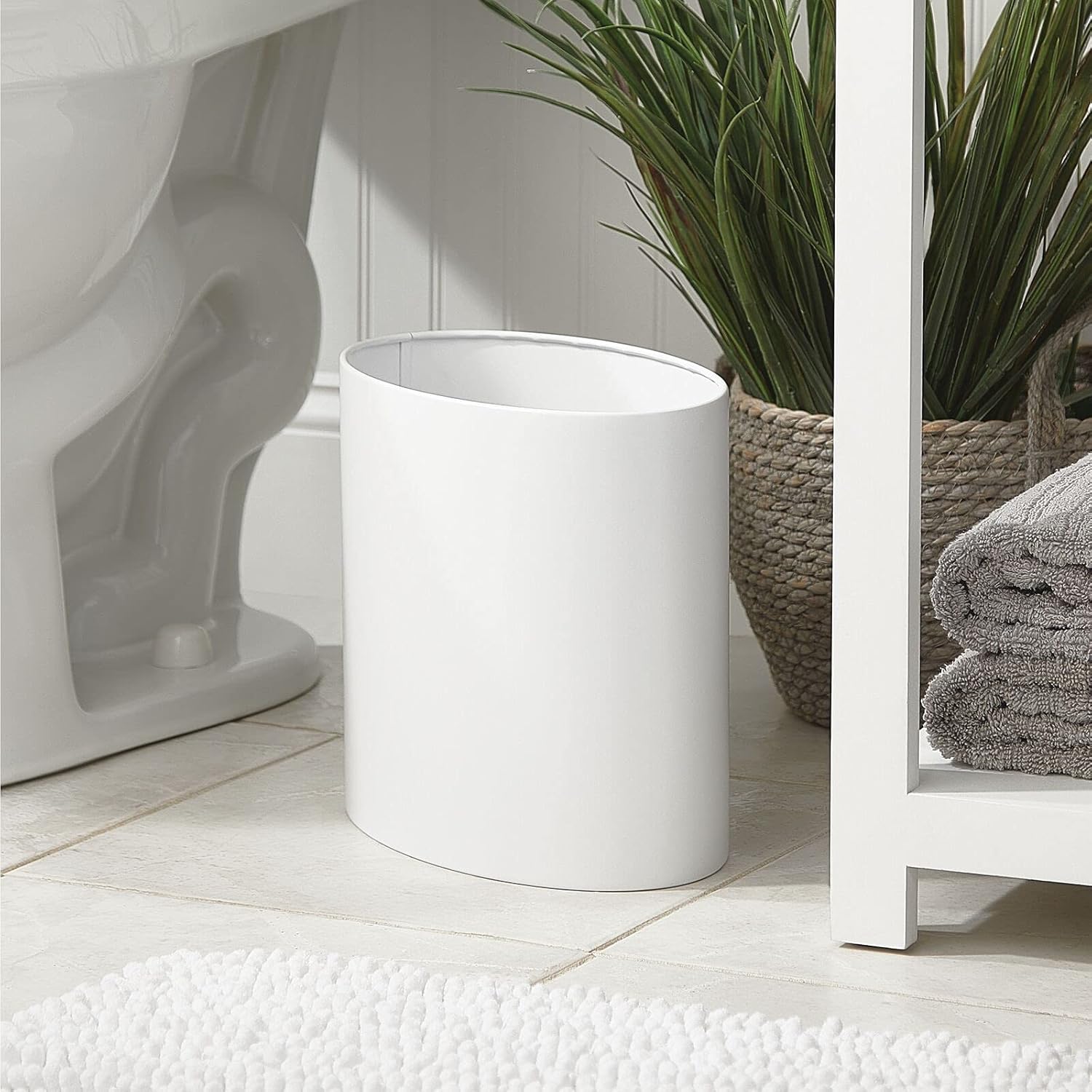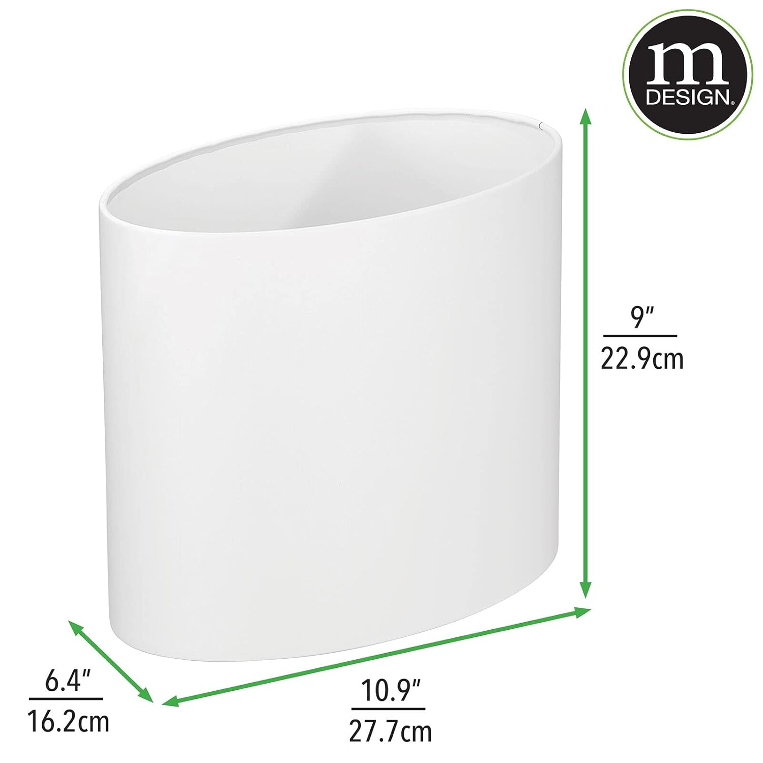 mDesign Stainless Steel Metal Oval Trash Can, 7.9 Liter/2.09 Gallon Wastebasket, Garbage Basket Bin for Bathroom, Bedroom, Kitchen, Home Office, Holds Waste and Recycle, Mirri Collection, White