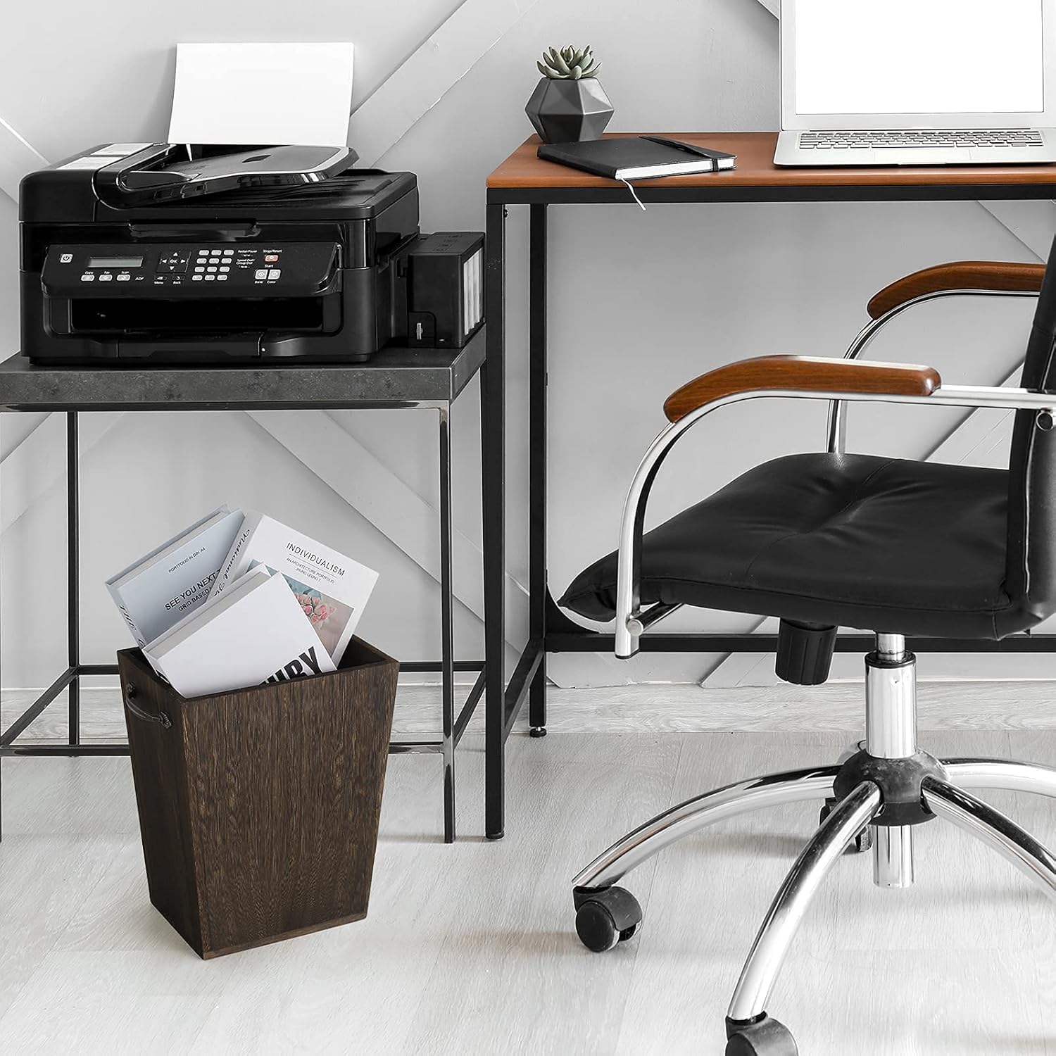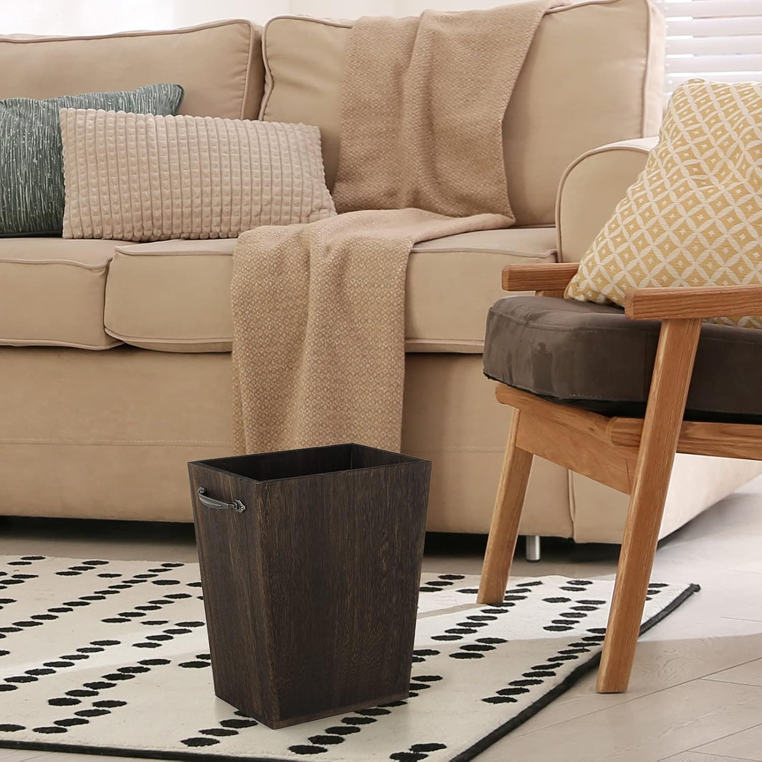 Trash Can Wastebasket Wood Garbage Container Bin with Built-in Double Metal Handles for Office, Bedroom, and Bathroom, Dark Brown