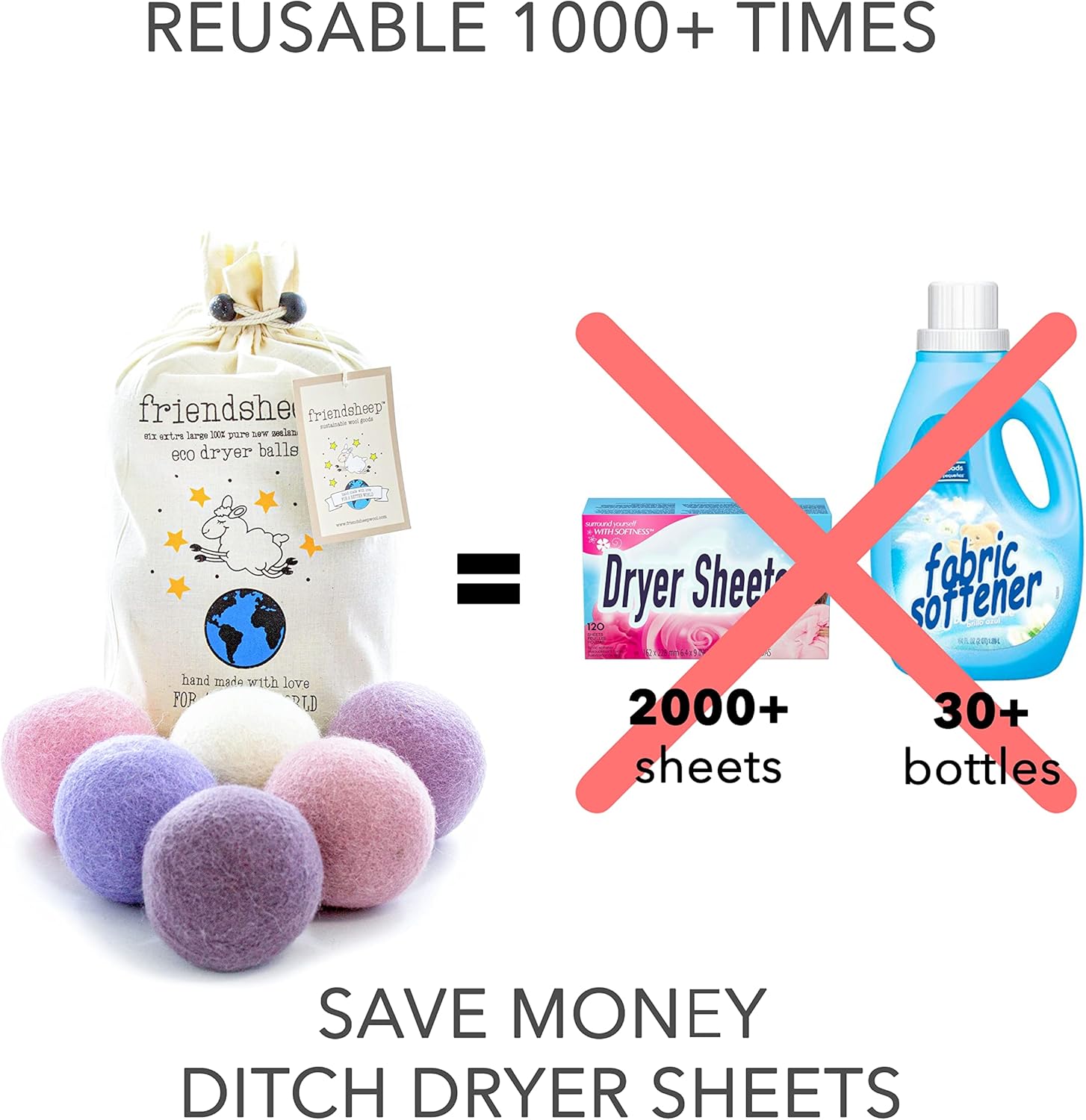 Friendsheep Wool Dryer Balls, Organic Reusable Fabric Softener Alternative for Laundry, Handmade, Fair Trade, Hypoallergenic, Eco-Friendly, Plastic-Free (6 Pack XL - Lavender Bliss)