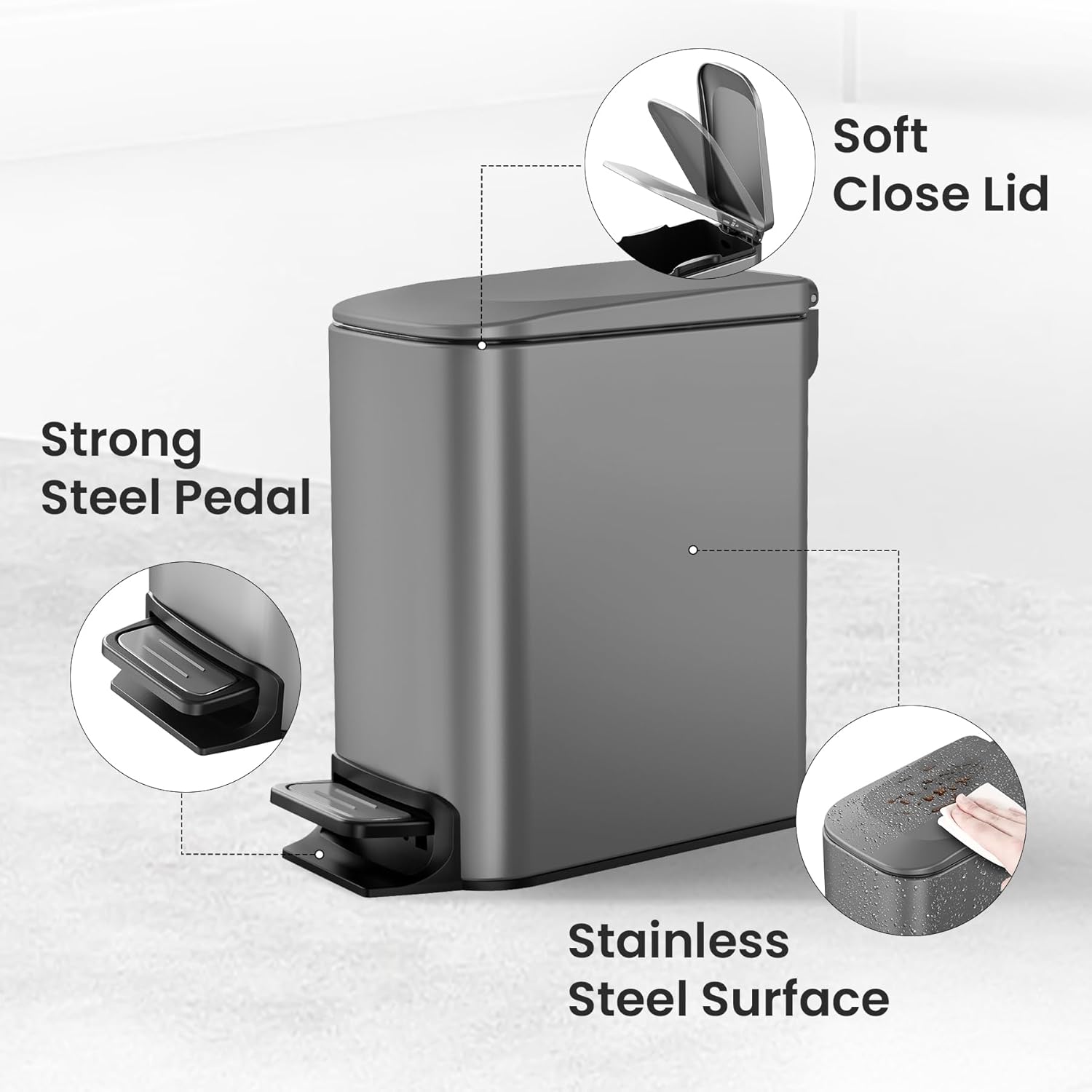 Cesun Small Bathroom Trash Can with Lid Soft Close, Step Pedal, 6 Liter / 1.6 Gallon Stainless Steel Garbage Can with Removable Inner Bucket, Anti-Fingerprint Finish (Gray)