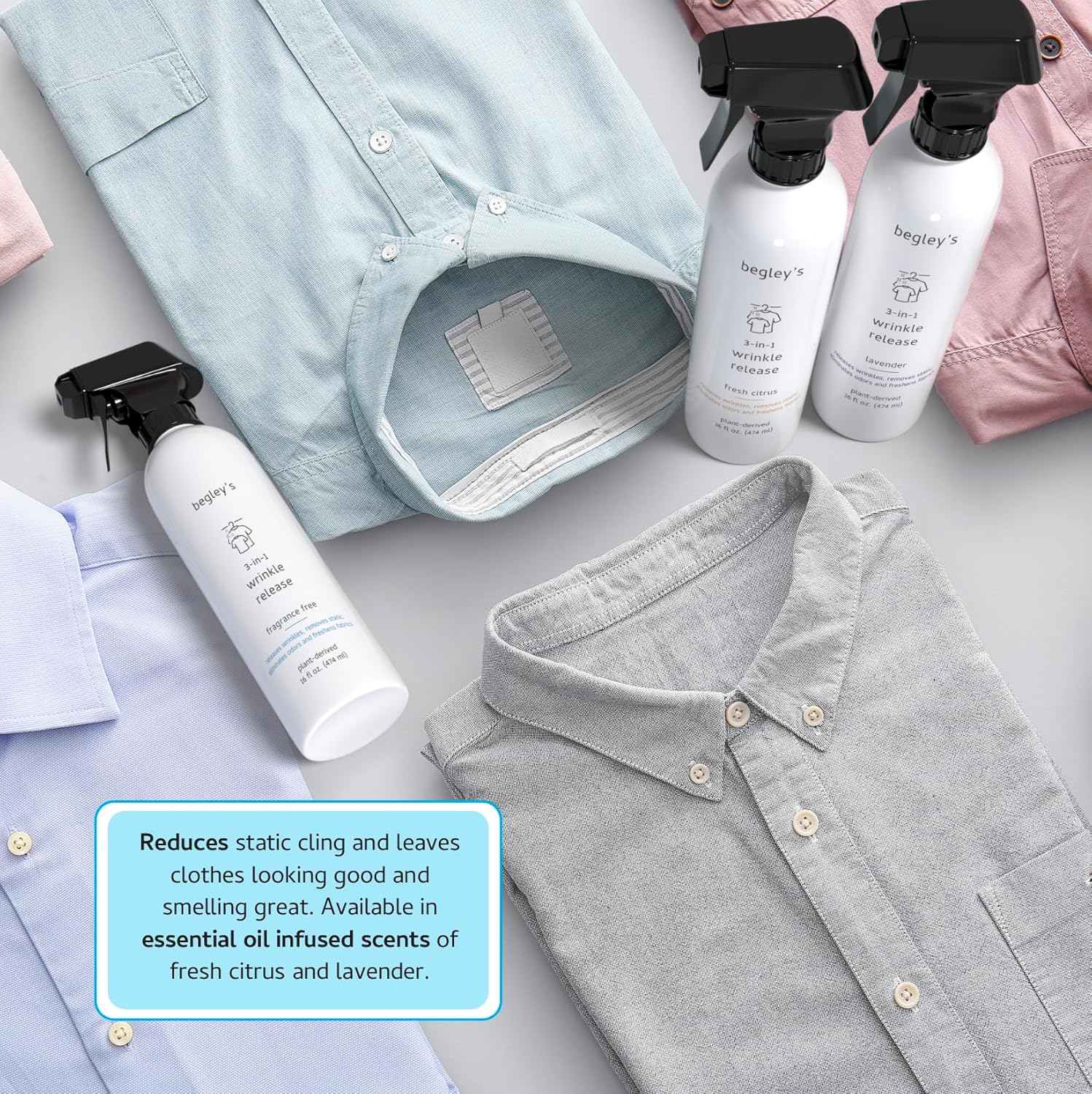 Begley's 3-in-1 Wrinkle Remover, Quick Fix Wrinkle Release, Static Cling Remover, Odor Eliminator and Fabric Refresher Spray - USDA Certified Biobased - Fragrance-Free, 3 oz Travel Size