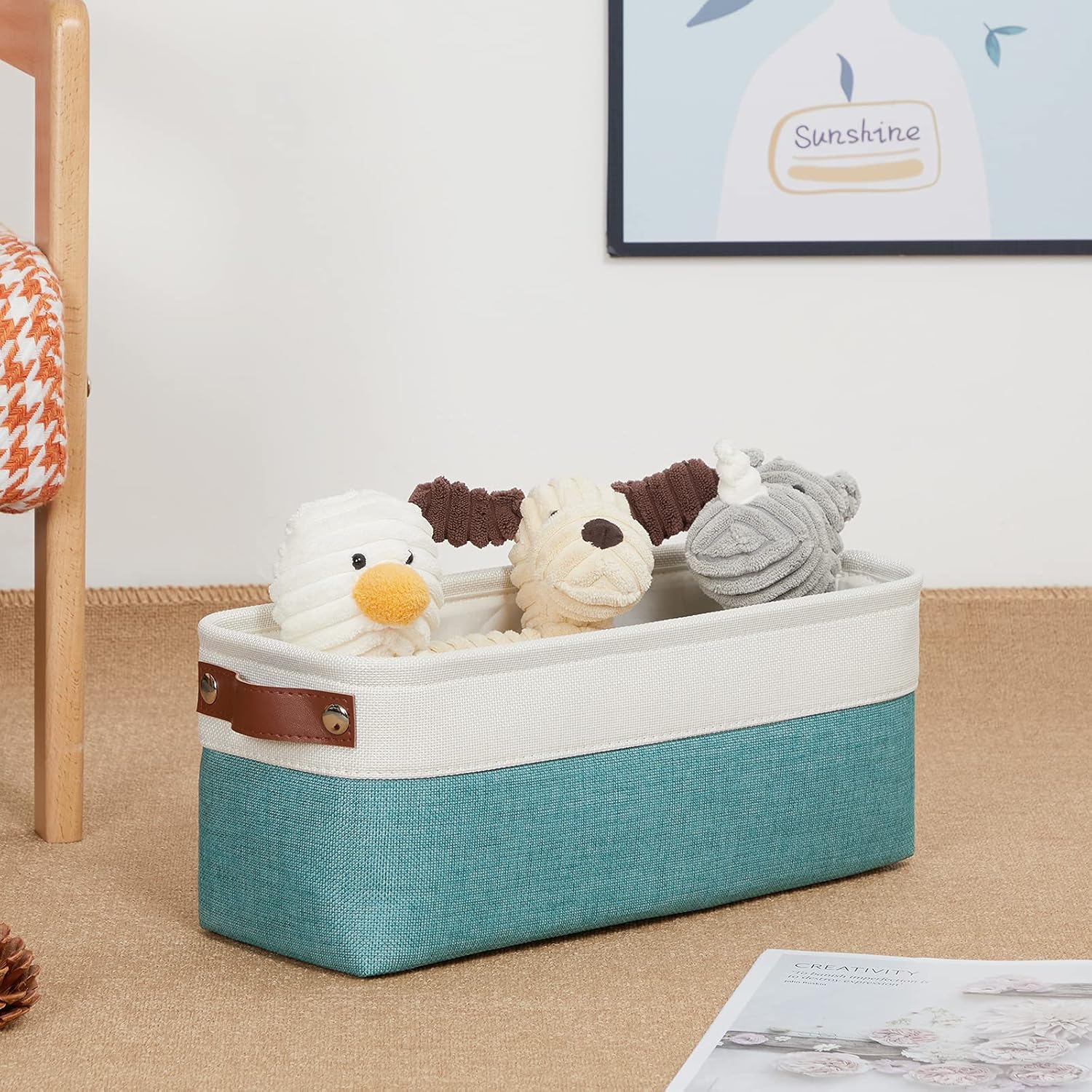 DULLEMELO Small Bathroom Closet Storage Baskets Canvas Fabric Storage Bins for Toilet 2 Pack Collapsible Home Organizer With Handles (White&Teal)