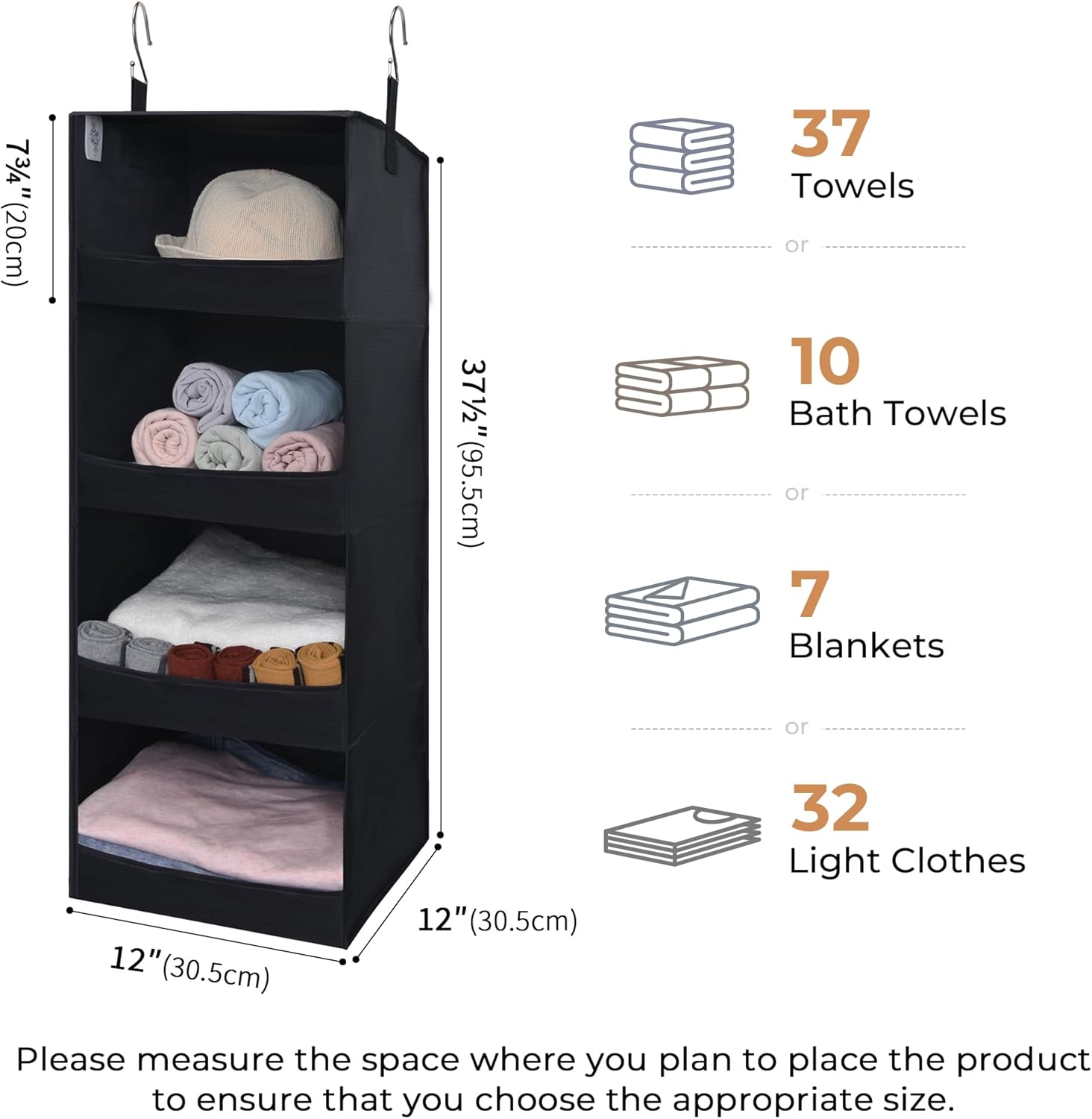 - Appropriate Size: The closet hanging organizers measures 37 ½" H X 12" W X 12" D, each shelf is 7 ¾" H X 12" W X 12" D. In addition, the hook is 6 ¼" H. The closet organizer and storages can be used in many places, closets, wardrobes, RVs, camps, bedrooms, dorms, and more.