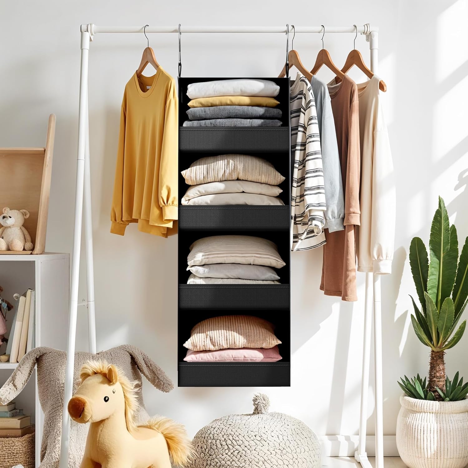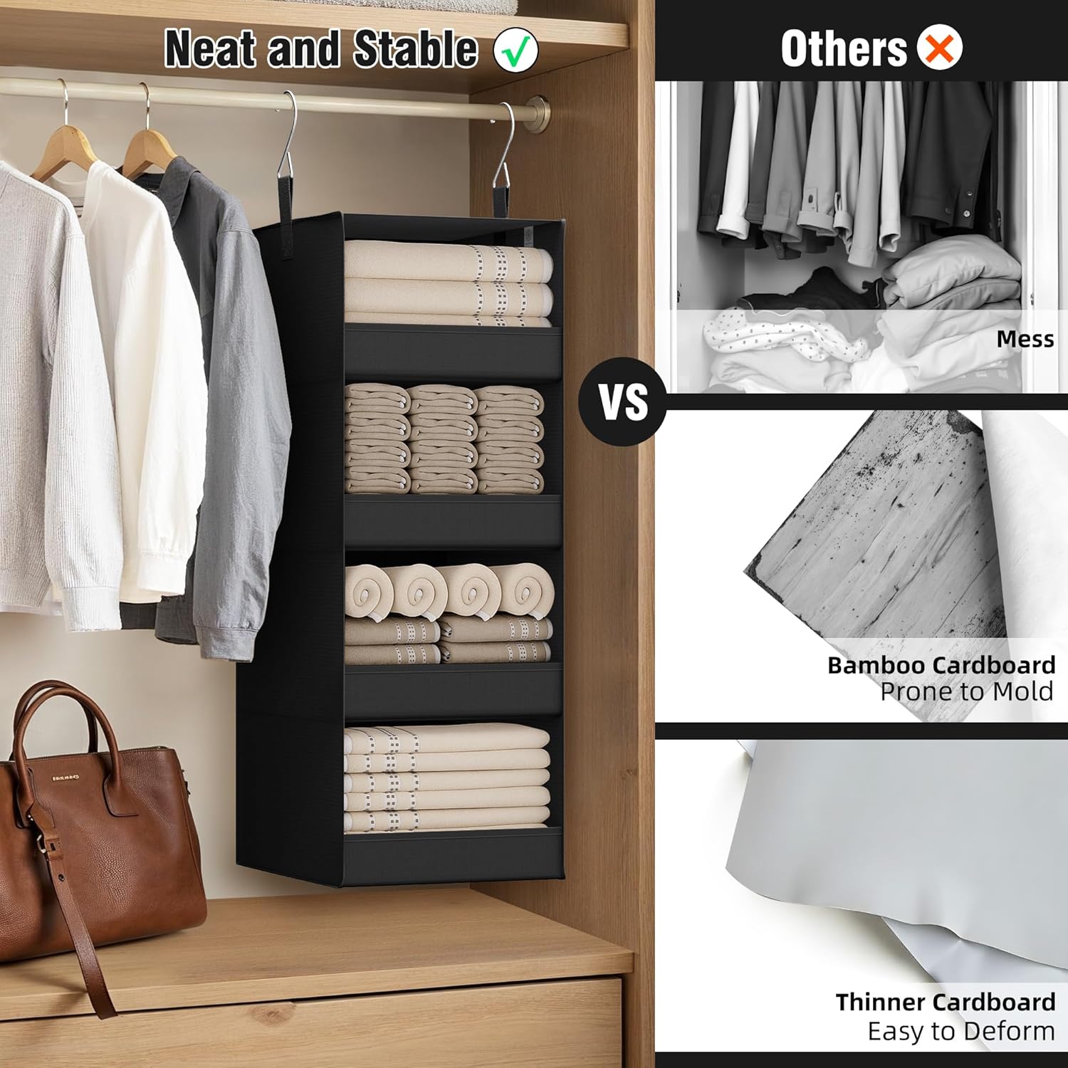 - Save Time and Space: Open hanging wardrobe shelves allow for easy storage, display and organization, saving time by providing visibility into your wardrobe contents. 4 shelves organizers work great in closets, shelves and wardrobes for storing clothes, towels, underwear, hats, socks, accessories, shoes, etc.