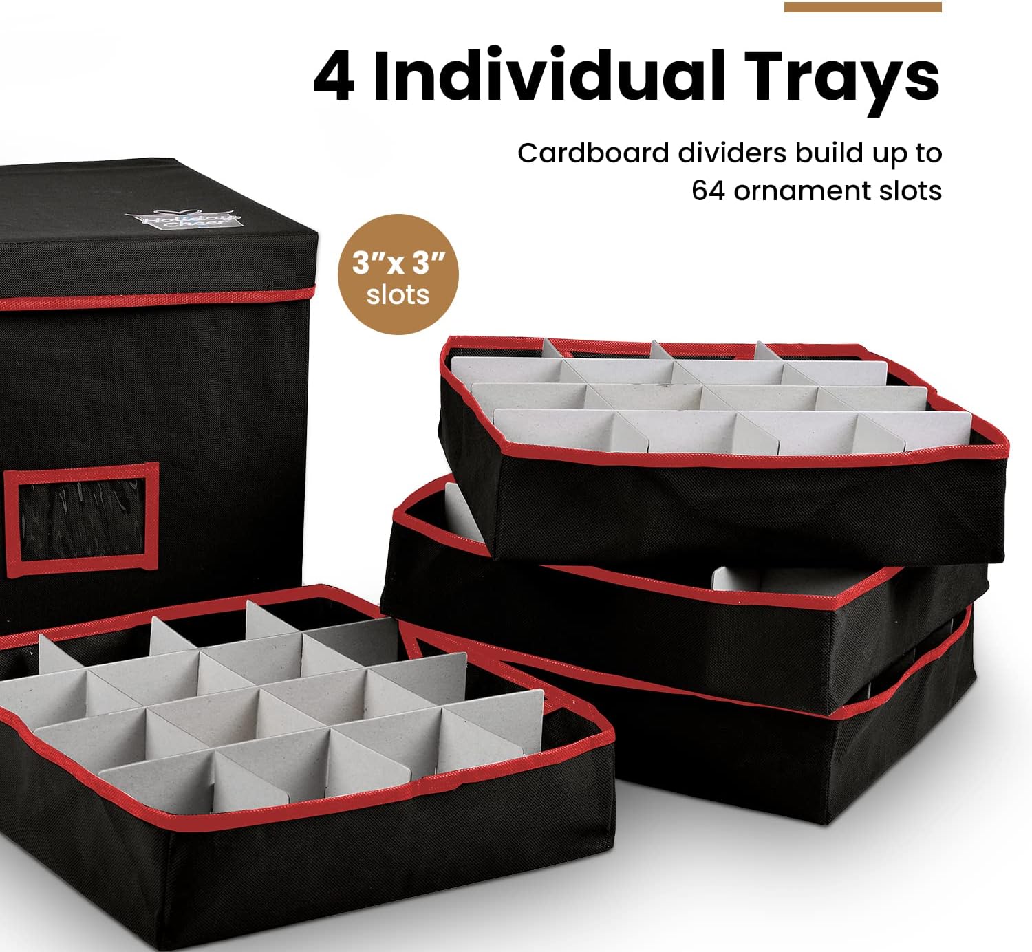 - ORNAMENT STORAGE – This ornament box stores up to 64 ornaments with individual carry trays that help keep ornaments safe from scratches and shattering, so they’re always ready to show off for the Christmas season, Easter, Halloween, and other special occasions.