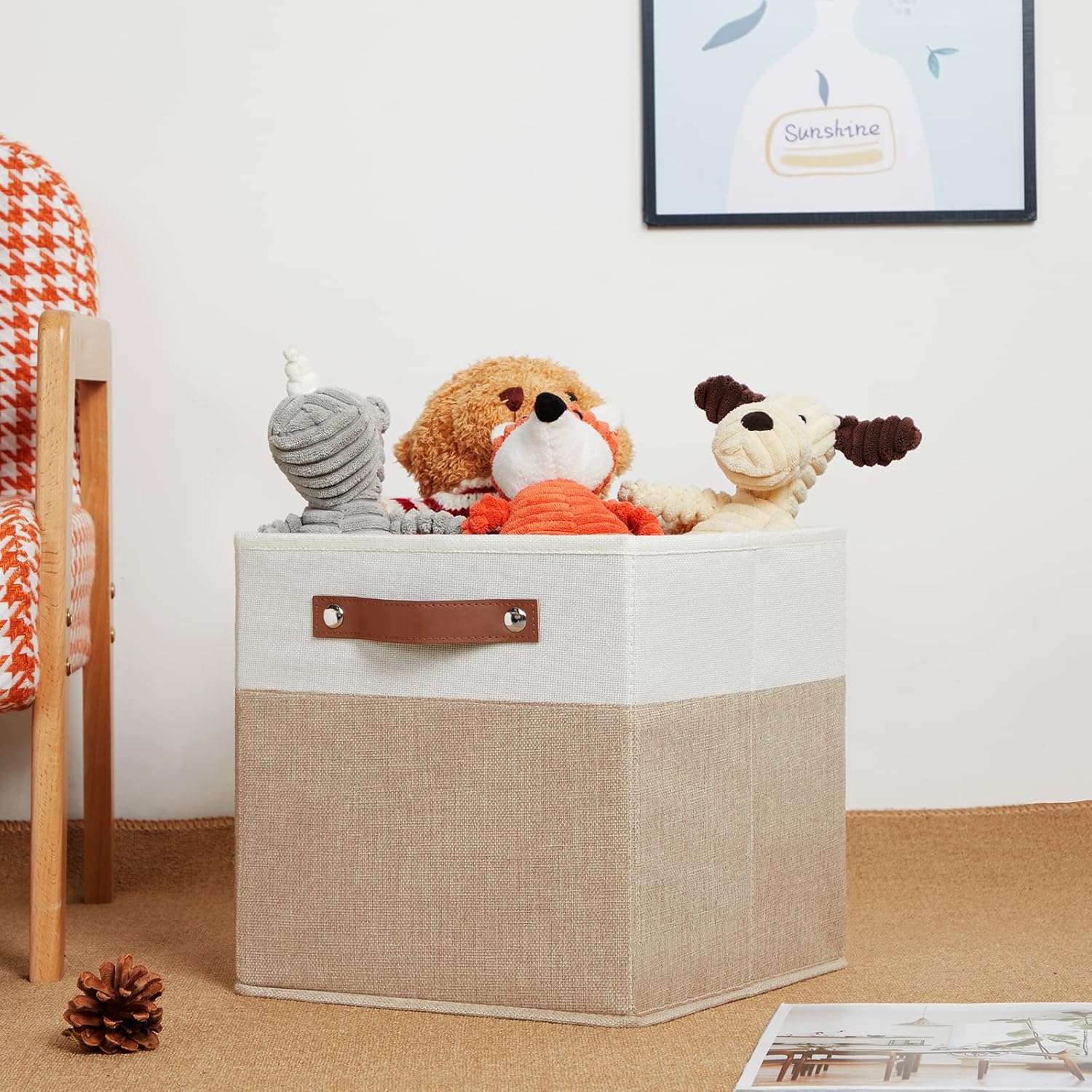 HNZIGE Fabric Storage Baskets Cubes Bins for Shelves, 11 x11 Foldable Storage Bins, Decorative Storage Basket with Leather Handles for Storage Clothes Home Nursery(White Beige-4Pack)