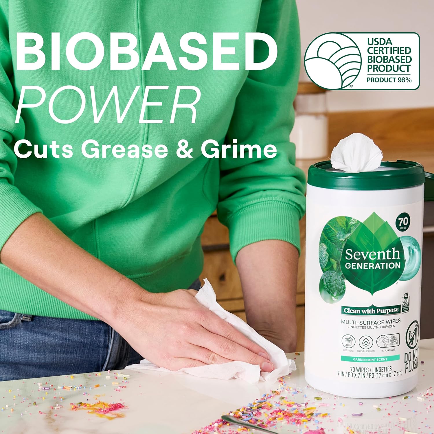 Seventh Generation Multi Purpose Wipes All Purpose Cleaning Garden Mint scent with 100% Essential Oils and Botanical Ingredients 70 count, Pack of 3