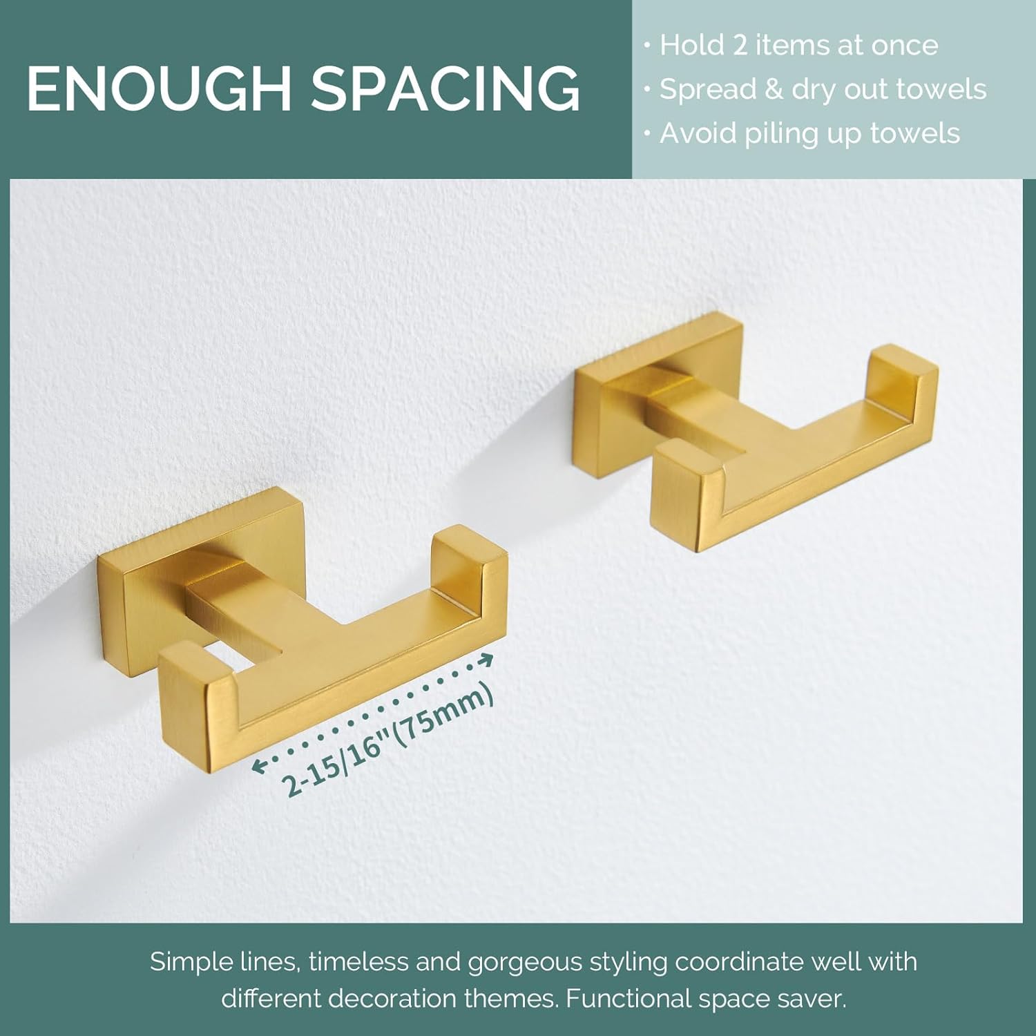 - THOUGHTFUL SUFFICIENT DISTANCE: 2 hooks space 2-15/16" (75mm), allow better drying out damp towels without bunching up, 1-9/16"(40mm) deep between the base and the hook for wider objects