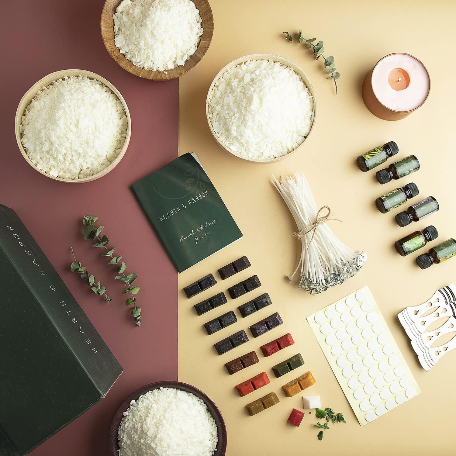 - All-In-One Starter Kit – Everything you need to dive into candle making! Our Hearth and Harbor soy candle wax for candle making includes 10 lb. bag wax, 16 dye blocks, 6 candle scents for candle making, 50 cotton candle wicks for candle making, 50 candle wick stickers, 4 wick holders. Perfect for beginners or seasoned DIYers.