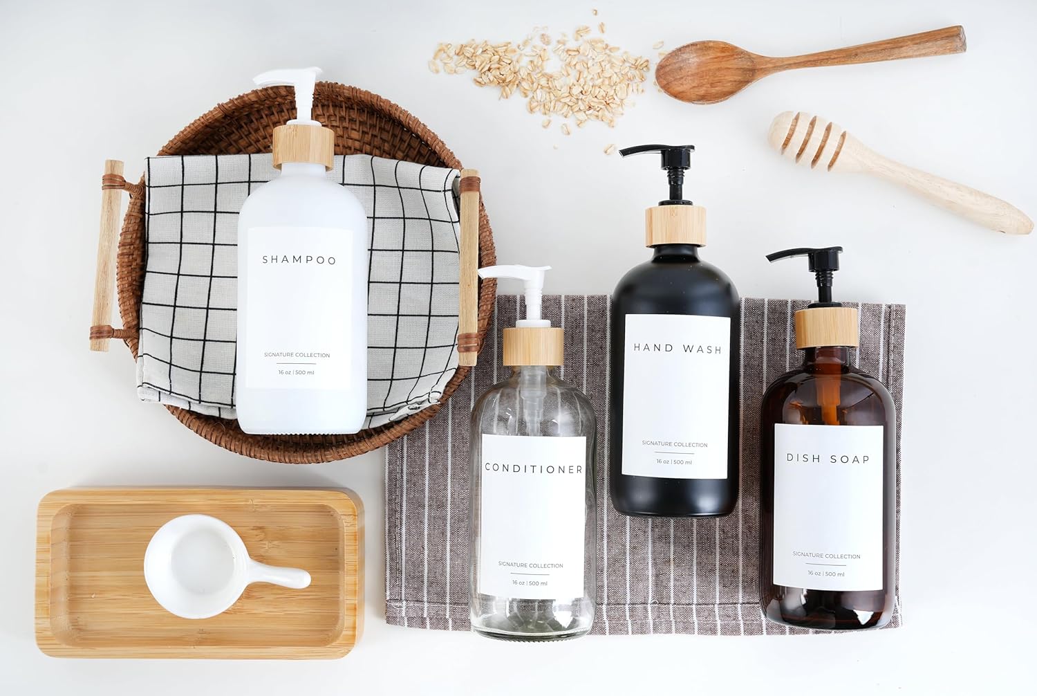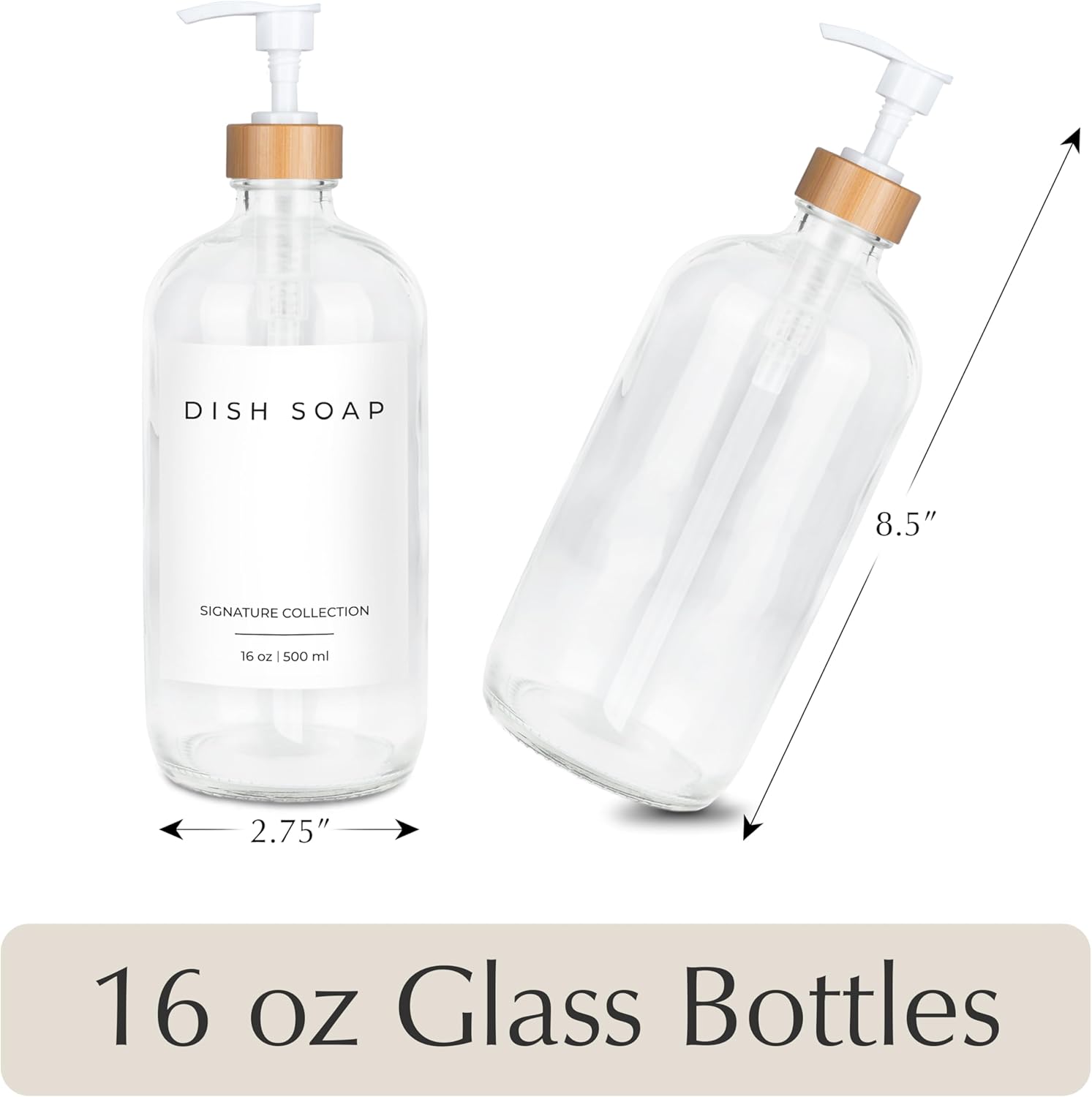 - ✅ 2-in-1 COMBO: Upgrade your home with our glass soap dispenser set. The dish soap dispensers are crafted from the highest quality glass and can be used as soap dispensers for kitchen sinks, soap dispensers for bathrooms, or as hand soap dispenser of your favorite liquid. The kitchen soap dispensers come with 2 dish soap dispensers for kitchen bottles (16 ounces), 2 stainless steel pumps, and 5 waterproof labels. Our selection includes colors including amber, clear, white, and black.