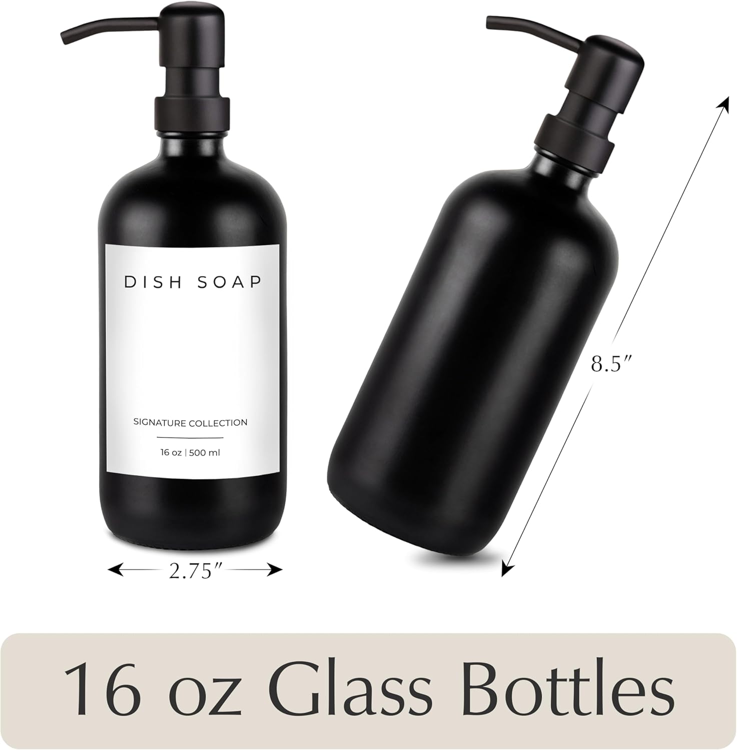 - ✅ 2-in-1 COMBO: Upgrade your home with our glass soap dispenser set. The dish soap dispensers are crafted from the highest quality glass and can be used as soap dispensers for kitchen sinks, soap dispensers for bathrooms, or as hand soap dispenser of your favorite liquid. The kitchen soap dispensers come with 2 dish soap dispensers for kitchen bottles (16 ounces), 2 stainless steel pumps, and 5 waterproof labels. Our selection includes colors including amber, clear, white, and black.