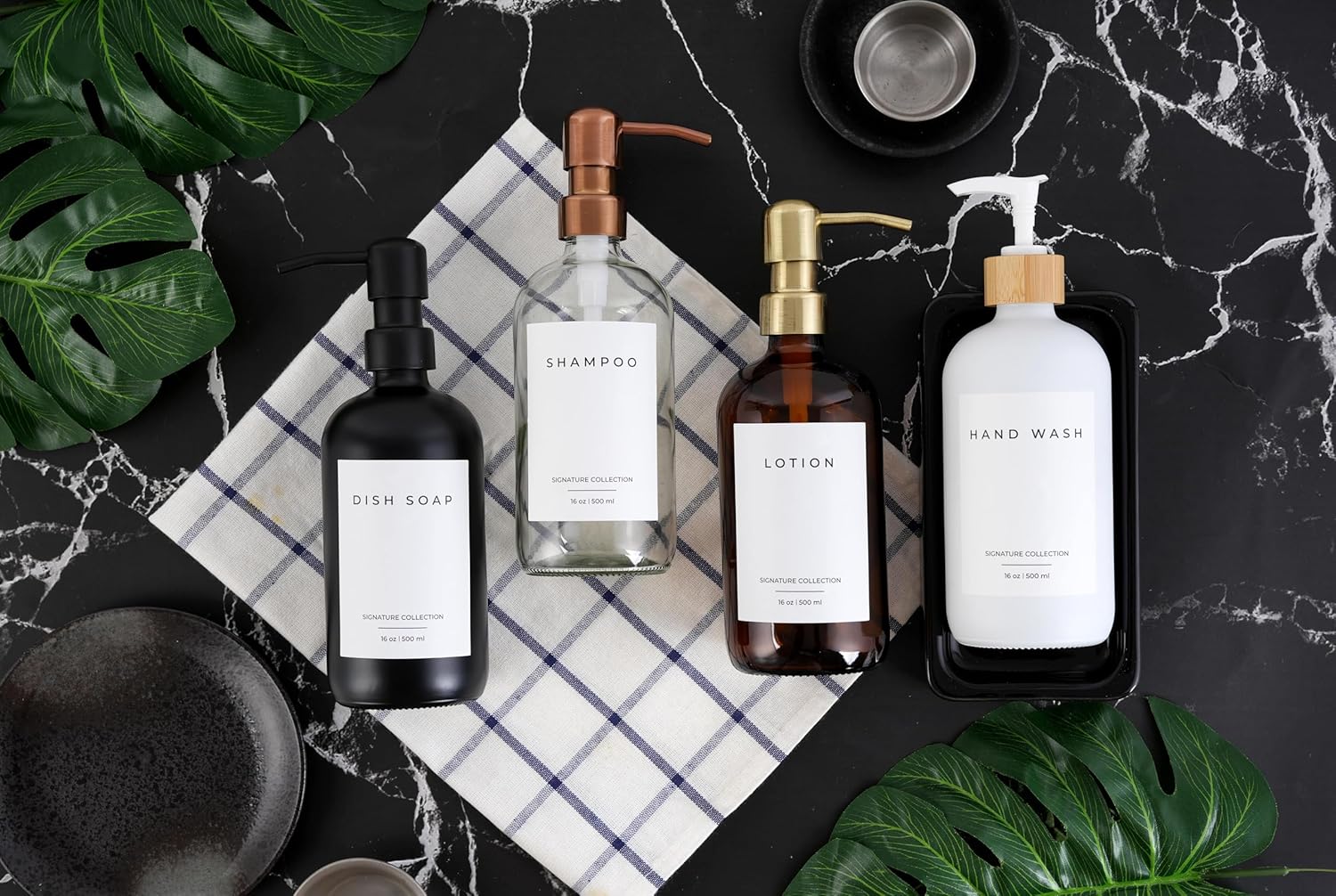 - ✅ 2-in-1 COMBO: Upgrade your home with our glass soap dispenser set. The dish soap dispensers are crafted from the highest quality glass and can be used as soap dispensers for kitchen sinks, soap dispensers for bathrooms, or as hand soap dispenser of your favorite liquid. The kitchen soap dispensers come with 2 dish soap dispensers for kitchen bottles (16 ounces), 2 stainless steel pumps, and 5 waterproof labels. Our selection includes colors including amber, clear, white, and black.